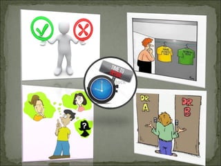 The document discusses the differences between problem solving and decision making. Problem solving is focused on addressing differences between the current and desired situation, while decision making is focused on choosing between options for the future. The document also outlines various types of problems, steps in problem solving, advantages and disadvantages of decision trees, and methods for group decision making like the Delphi method and Nominal Group Technique.