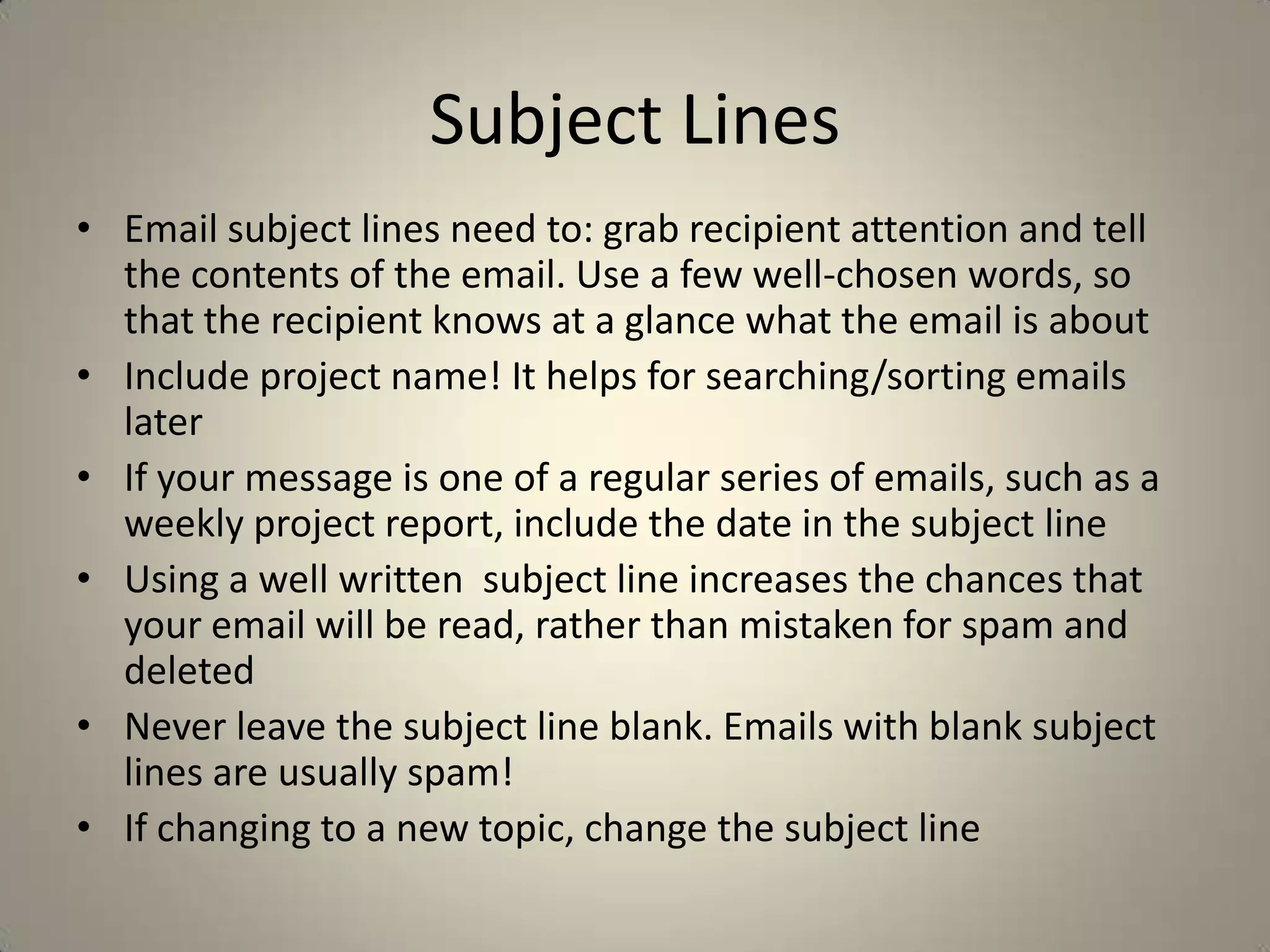 Effective email communications require well-written subject lines that clearly convey the email's topic. Subject lines should include any relevant project names and dates for recurring emails. The body of the email should state the purpose upfront, use paragraphs to separate ideas, and specify any desired outcomes or next steps. Tone and formality should be tailored to the audience, and emails are not suitable when information is long, confidential, or emotionally charged. Key tips include using proper grammar, proofreading before sending, and avoiding all-caps or overuse of priority and reply-all functions.