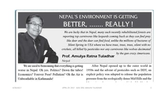 The document discusses environmental management in Nepal, particularly focusing on the challenges of scientific and non-scientific approaches. It highlights issues like deforestation and air pollution, emphasizing that despite scientific efforts, significant environmental problems persist. The text also mentions the role of community forestry user groups and encourages ethical considerations in environmental practices.