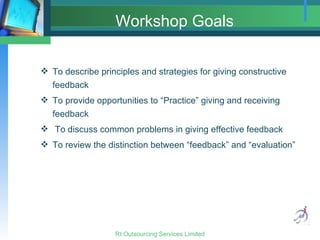 The document discusses principles and strategies for providing effective feedback. It describes feedback as timely, specific, descriptive, and focused on behaviors that can be improved. Effective feedback involves setting goals, monitoring progress, and developing action plans. Feedback should be given frequently and include both positive reinforcement and constructive criticism to promote learning and professional development.