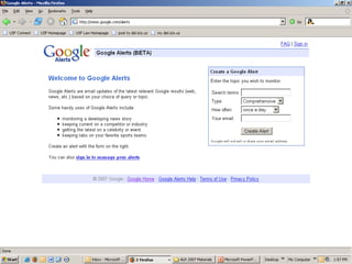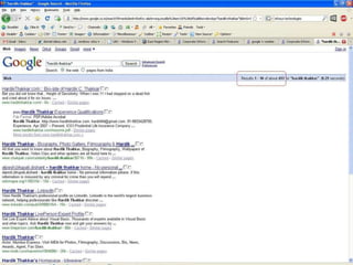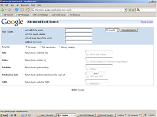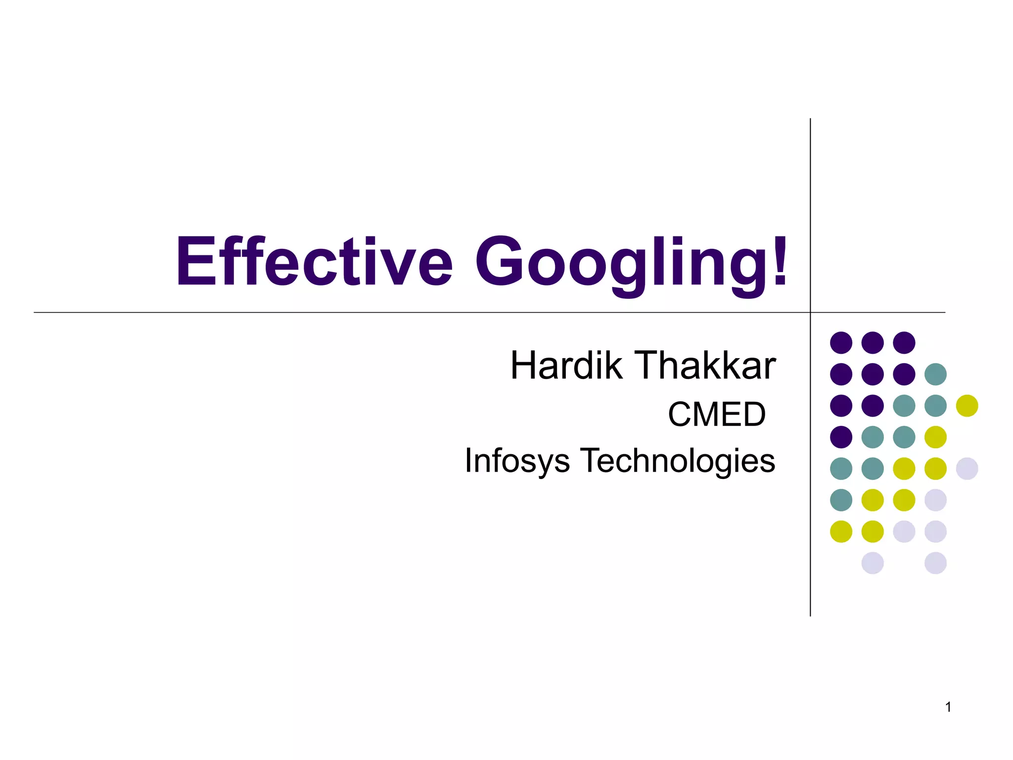 Google was founded in 1998 and has grown tremendously over the past 9 years. It now employs over 10,000 people worldwide and has indexed over 20 billion web pages. Google provides many useful search features beyond basic keyword searches, including searching by file type, negative search terms, and limiting searches to specific websites. It also offers specialty search tools for news, images, books, and more. Google has become much more than just a search engine and now provides many free services like Gmail, Calendar, Docs and more.