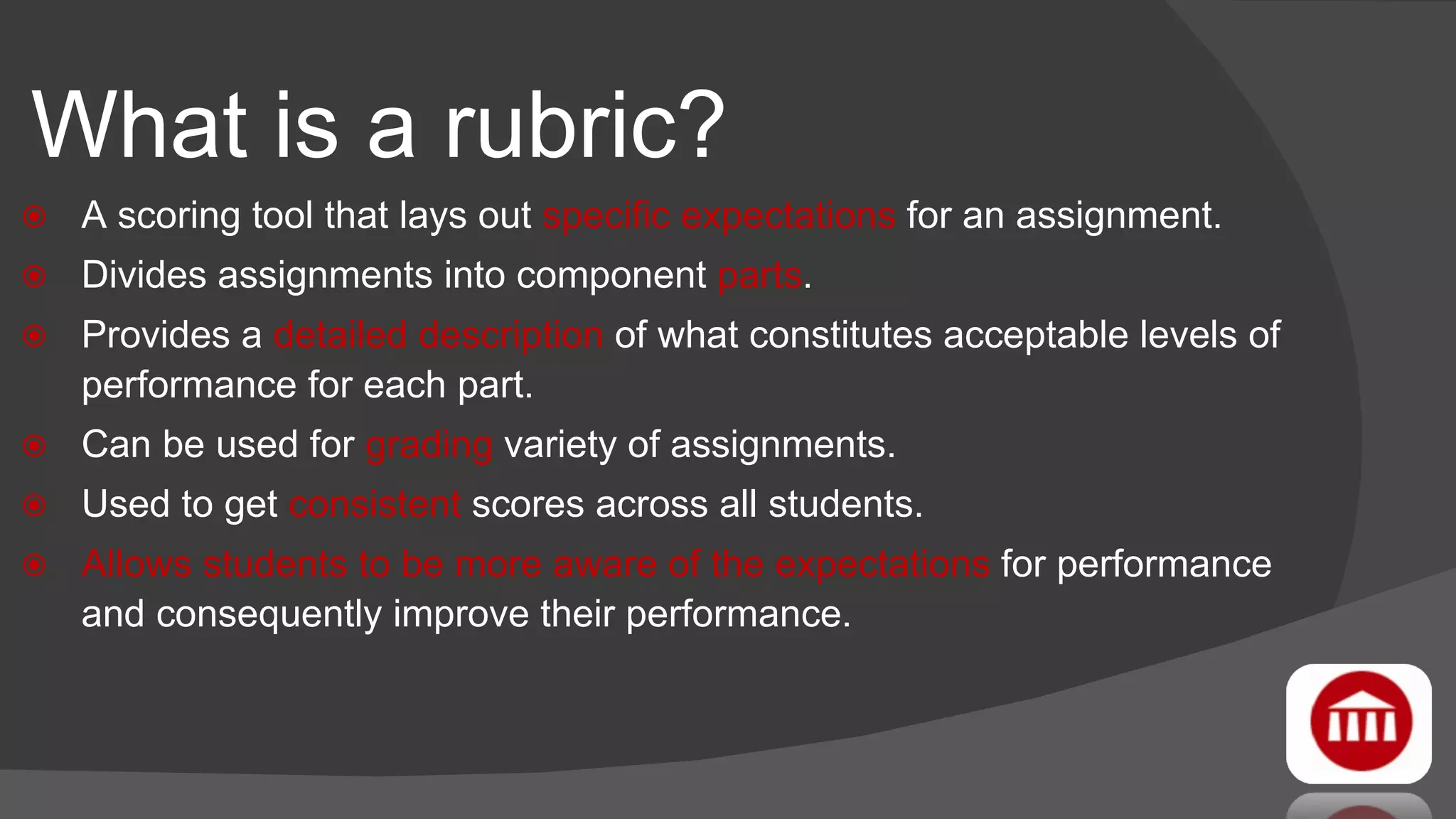 A rubric is a scoring tool that divides an assignment into components and provides detailed descriptions of acceptable performance levels for each component. Rubrics improve consistency in grading, make expectations clear to students, and provide feedback to help students improve. Key parts of an effective rubric include a task description, performance levels with associated points or scores, dimensions/criteria being assessed, and descriptions of what constitutes each performance level. Rubrics should be shared with students before assignments to clarify expectations and allow self-assessment.