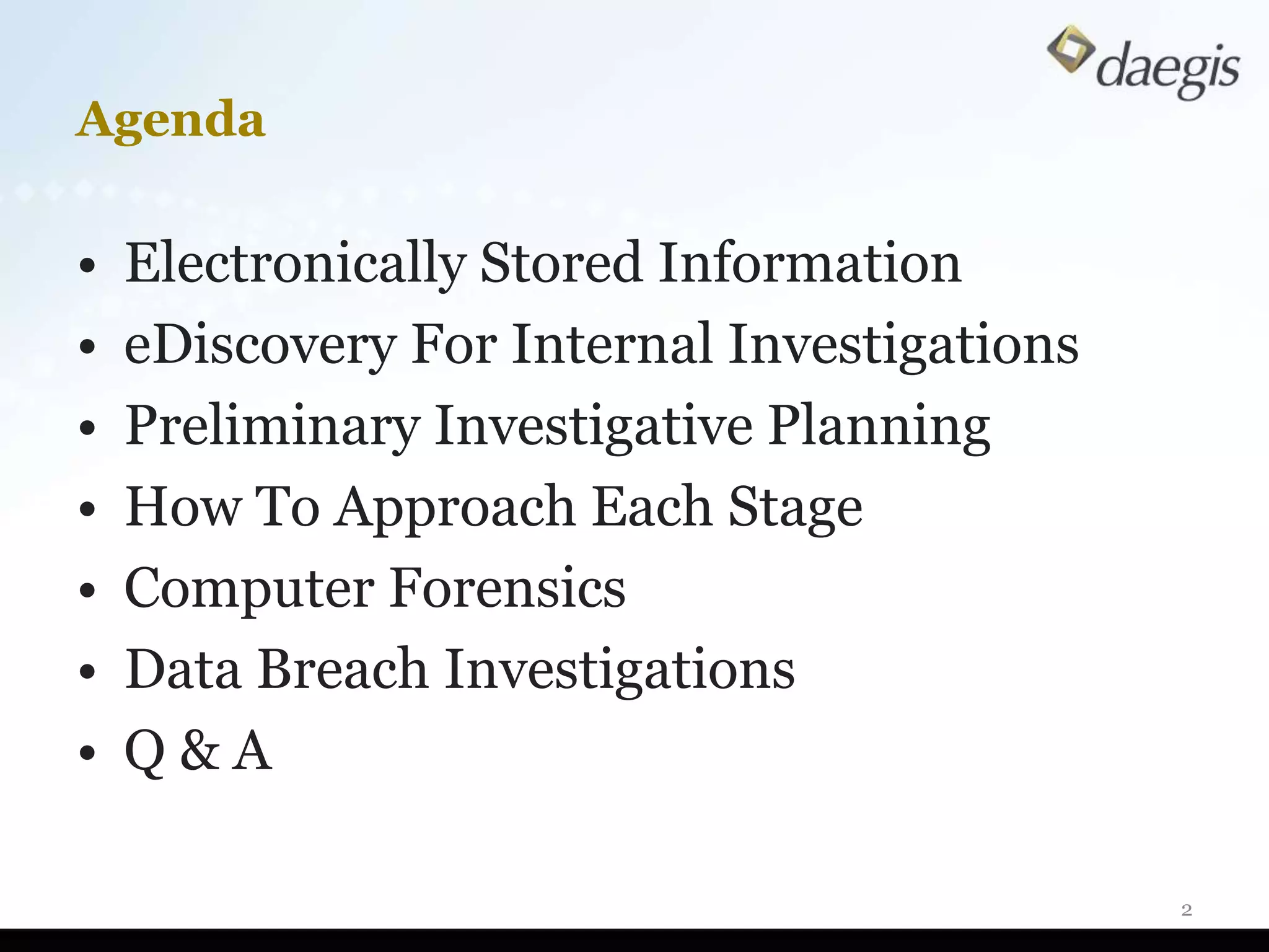 The document outlines critical activities and considerations for conducting effective internal investigations involving electronically stored information (ESI). It covers various stages of the e-discovery process, including data identification, collection, analysis, and the importance of proper planning and team collaboration. Key topics include the nature of investigations, data forensics, metadata, and best practices for data protection and compliance.