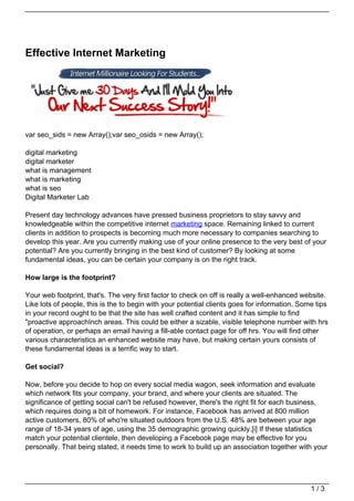 Effective internet marketing requires businesses to have an optimized online presence. It is important to have a well-designed website with useful contact information and social media profiles that align with your target audience. Regularly posting engaging content on platforms like Facebook and LinkedIn can help build your audience and promote your brand. Testing various digital marketing tools and strategies is key to staying up-to-date on the latest effective methods.