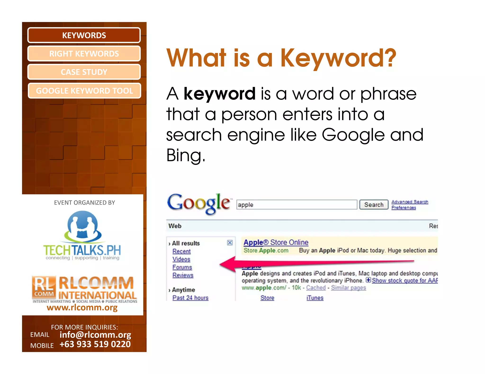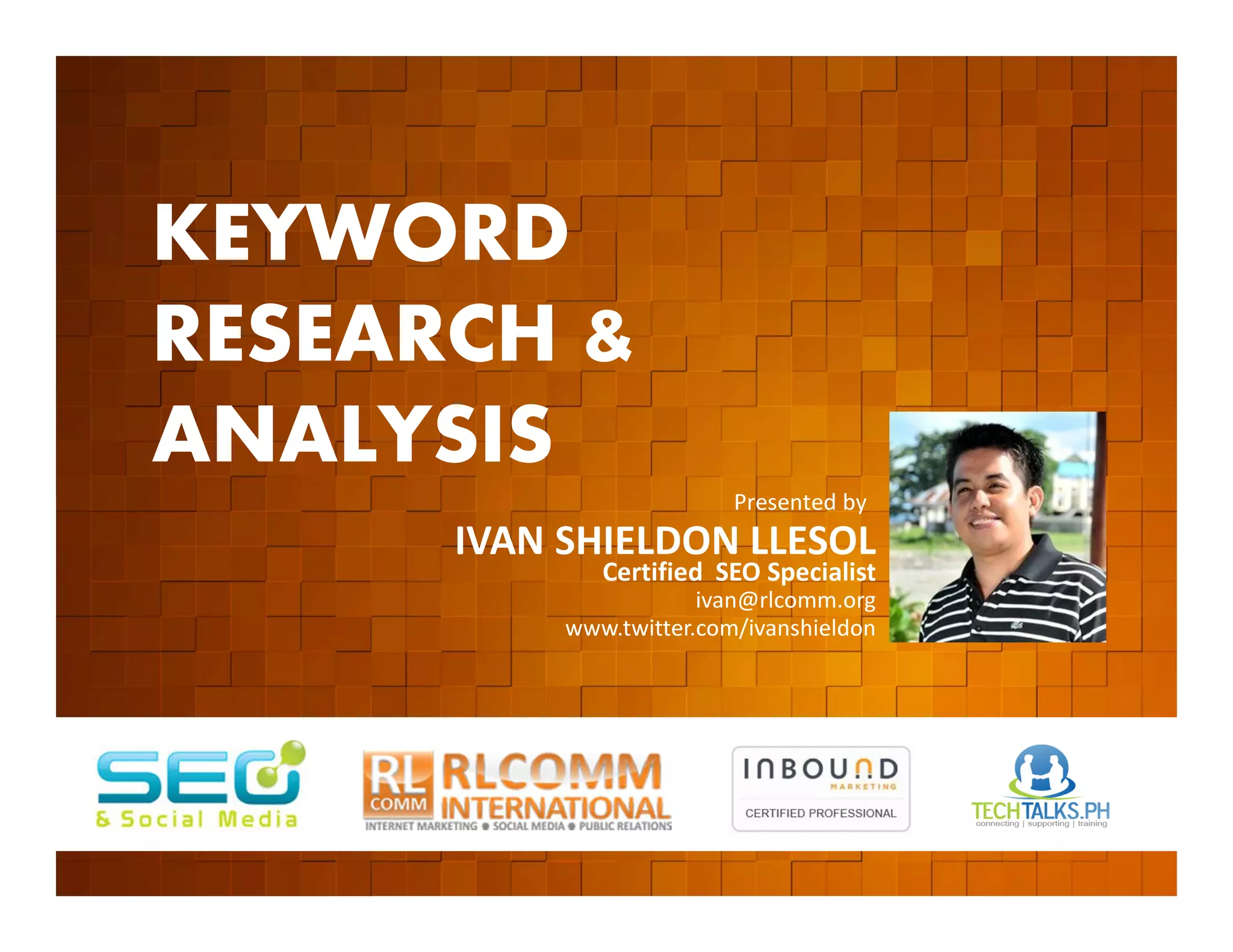 The document outlines a keyword research and analysis event presented by Ivan Shieldon, a certified SEO specialist. It emphasizes the importance of selecting the right keywords for improving search engine rankings and provides a case study related to the business 'Softball Hitting Online'. The document also recommends using Google's keyword tools for effective keyword research.