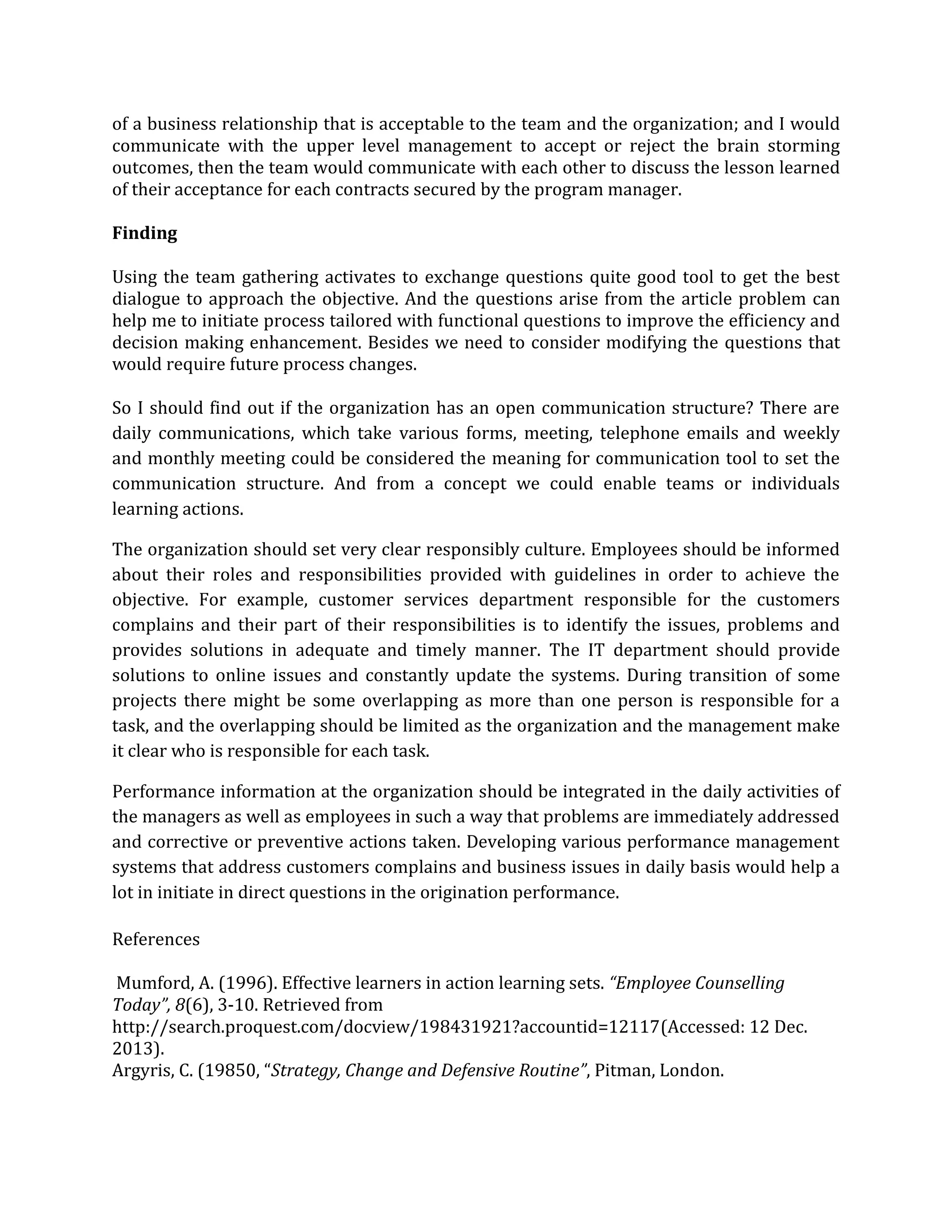This study explores the effectiveness of learners in action learning sets and the challenges faced in this context. It emphasizes the importance of structured group discussions, open communication, and defined responsibilities to enhance decision-making and meet organizational objectives. The document also highlights the need for managers to integrate performance information into daily activities to address problems promptly.
