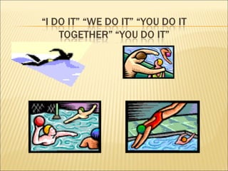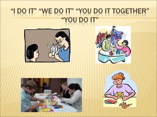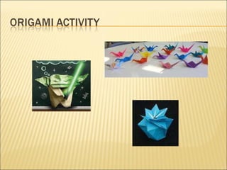 The document outlines steps for an activity using origami folding and the gradual release of responsibility model for instruction. It includes directions for folding origami whales, frogs, and swans. It then presents charts and questions for groups to discuss their experiences with different learning activities and levels of teacher responsibility versus student responsibility in lessons. Finally, it provides information and guidance for implementing the gradual release of responsibility instructional framework in the classroom.