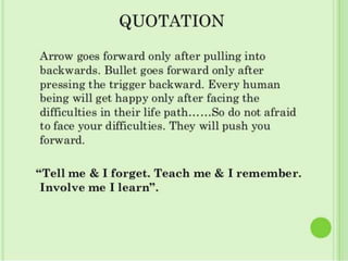 The document discusses effective lesson planning. It defines a lesson plan as a teacher's guide that includes goals, methods, and assessment. It outlines the typical elements of a lesson plan such as objectives, materials, and activities. It describes different types of assignments like whole-class lessons, group work, and independent practice. Finally, it discusses the importance of reflection and adjustment after teaching a lesson. Effective lesson planning helps teachers stay organized and achieve learning objectives.