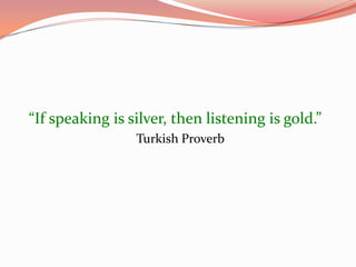The document discusses effective listening skills. It defines the difference between hearing and listening, with listening requiring focus and understanding. It outlines barriers to listening like environment, semantics, personal factors, and socio-cultural differences. Key listening skills include focusing without distraction, reading body language and facial expressions, asking clarifying questions, maintaining eye contact and nodding to show engagement, understanding other perspectives, and listening to implicit and explicit messages. The document provides 10 commandments of effective listening like stopping talking, making others comfortable, concentrating on verbal and nonverbal cues, avoiding assumptions, being patient without interrupting, controlling emotions, and empathizing with the speaker.