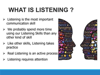 Listening is the most important communication skill. It requires attention and is an active process of analyzing, organizing, interpreting sounds to understand messages. Many problems in relationships stem from poor listening skills. Effective listening involves hearing, filtering, comprehending, remembering and responding to the message. It is important for learning, understanding, advising others, and reducing boredom. Barriers to listening include physical obstacles, physiological factors, and psychological influences like preconceptions, anxiety, impatience and ego. Developing focused attention, letting the speaker finish, asking questions and providing feedback can improve listening abilities.