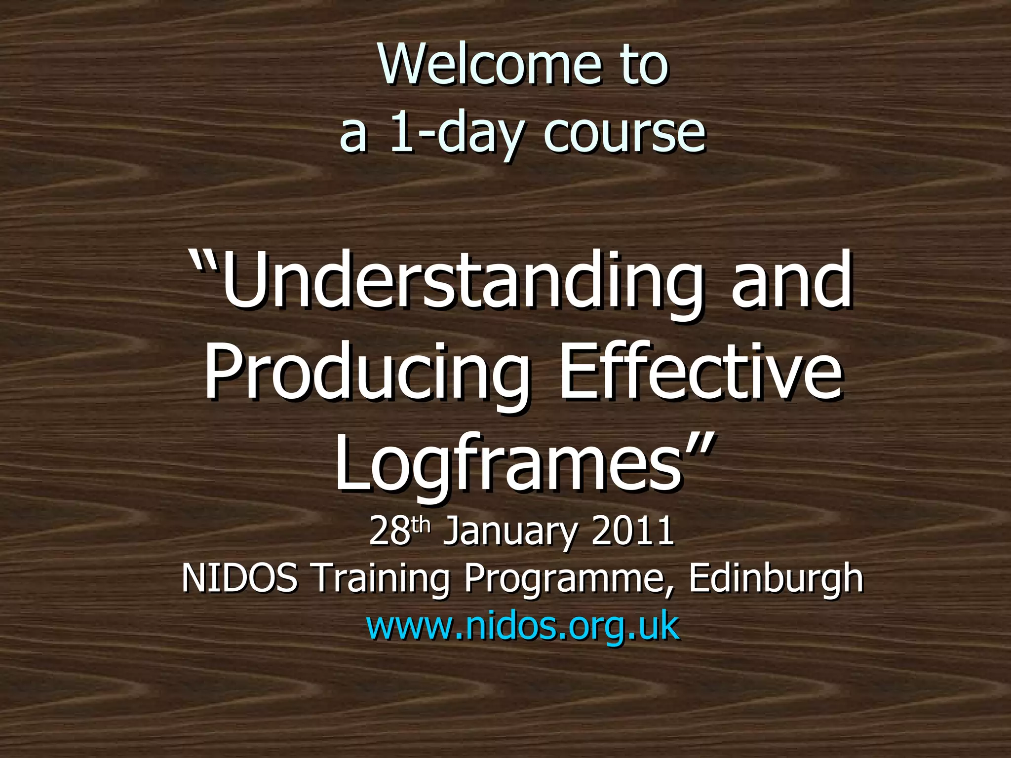 The document provides an agenda and overview for a 1-day training course on understanding and producing effective logframes. The training will cover the basics of logframes including terminology, examples, and building a logframe from problem analysis through completion. Attendees will learn to think through projects using a logical framework model and develop a logframe for a project working in small groups. Key aspects of logframes like assumptions, indicators, and ensuring the logframe is a useful planning tool are also discussed.