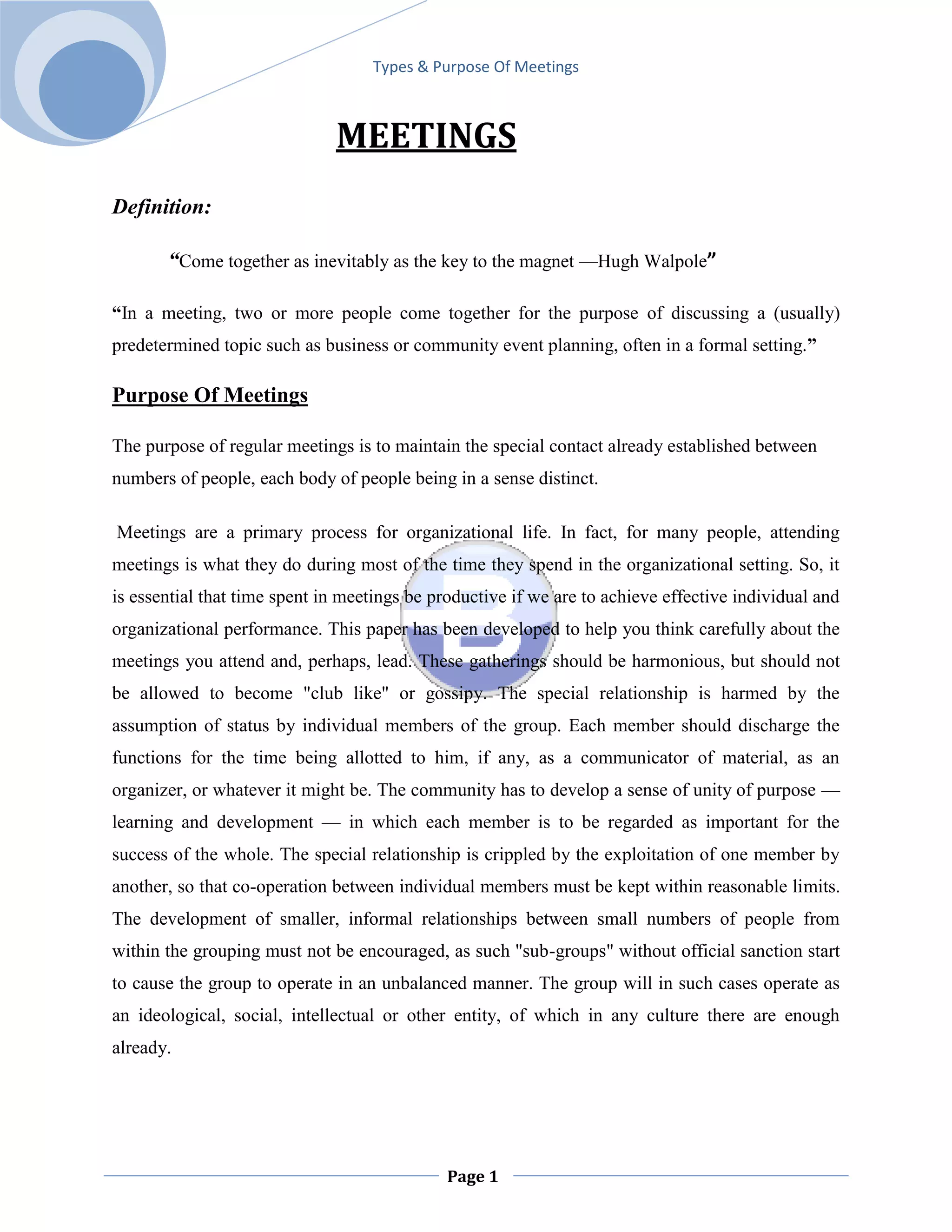 The document discusses types and purposes of meetings. It defines meetings as gatherings of two or more people to discuss a predetermined topic, often in a formal setting. Meetings serve to maintain contact between groups and are important for organizational life. They should have clear goals and agendas to stay focused and on time. Effective meetings depend on preparation, including setting objectives and allocating times for each agenda item. Meeting organizers and participants both have responsibilities to make meetings productive.