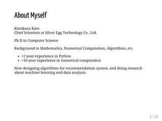This document provides an overview of effective numerical computation in NumPy and SciPy. It discusses how Python can be used for numerical computation tasks like differential equations, simulations, and machine learning. While Python is initially slower than languages like C, libraries like NumPy and SciPy allow Python code to achieve sufficient speed through techniques like broadcasting, indexing, and using sparse matrix representations. The document provides examples of how to efficiently perform tasks like applying functions element-wise to sparse matrices and calculating norms. It also presents a case study for efficiently computing a formula that appears in a machine learning paper using different sparse matrix representations in SciPy.