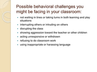 This document discusses techniques for managing behavior and supporting exceptional learners, including functional behavior assessments and positive behavior programs. It outlines potential behavioral challenges in the classroom like interrupting and lack of participation. Effective behavior management requires skills like implementing evidence-based interventions, differentiation, and data-driven decision making. Functional behavior assessments involve defining, collecting data on, and hypothesizing the reasons for problematic behaviors. Guidelines for establishing classroom rules include teaching expected behaviors and specifically praising compliance. Common positive behavior techniques are also outlined such as clear routines and thinking strategies for handling disruptions.