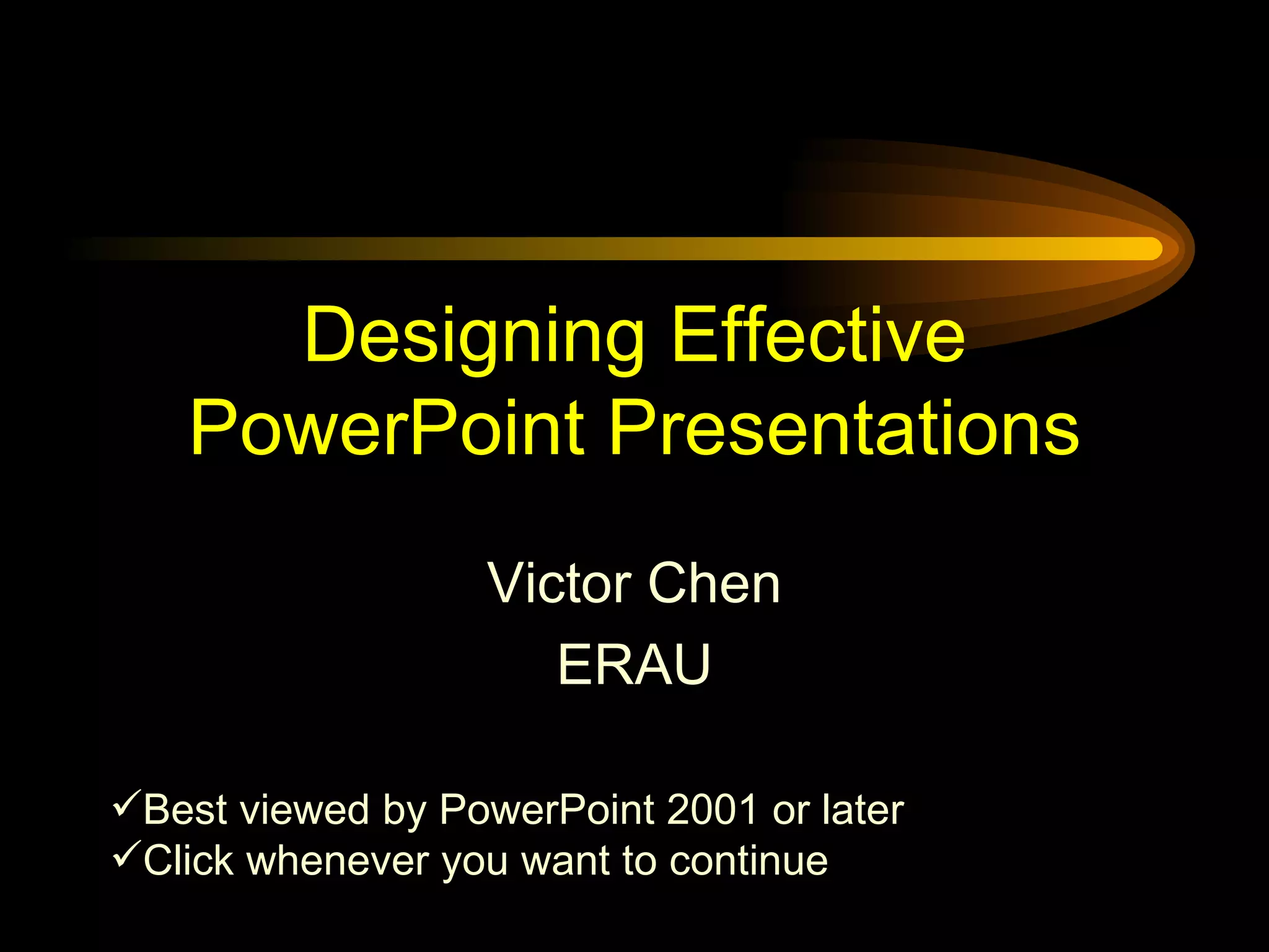 The document provides tips for designing effective PowerPoint presentations, focusing on keeping the presentations big, simple, clear, progressive, and consistent. Some key tips include using large font sizes, limiting the number of words and lines per slide, using contrasting colors and fonts, directing audience attention through focal points and size, introducing new concepts progressively, and maintaining consistency in design elements.