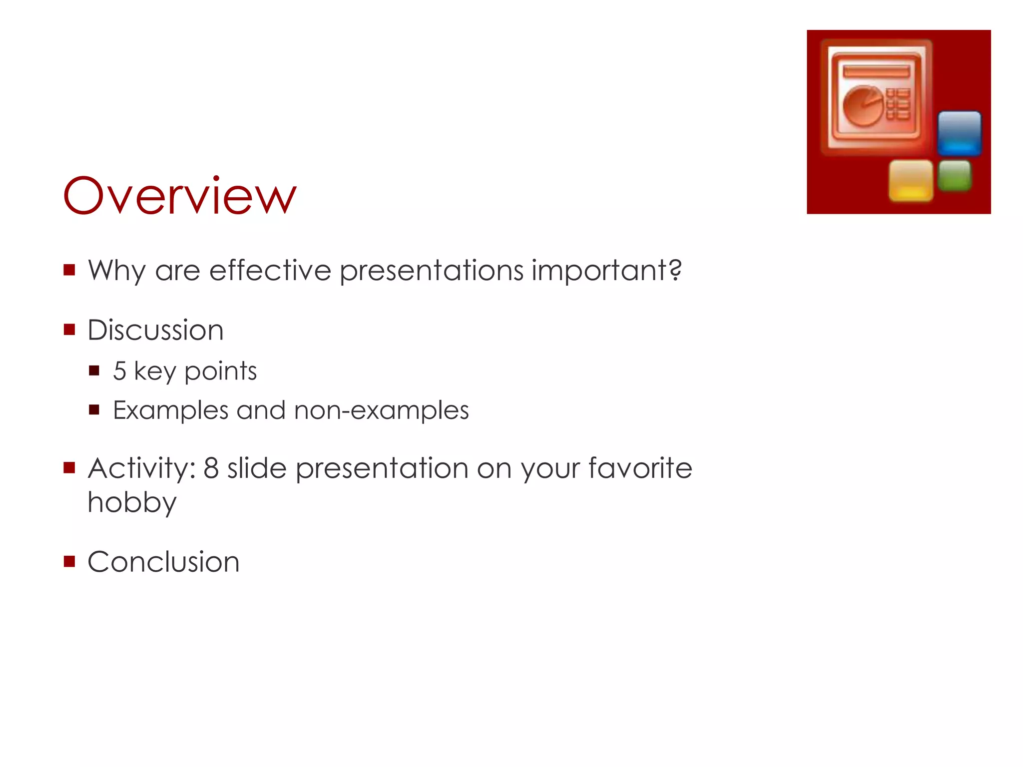 The document discusses 5 keys to creating effective PowerPoint presentations: 1) Choose a theme to provide structure and coordination, 2) Be consistent with fonts, colors, and transitions, 3) Use color purposefully for mood and legibility, 4) Use less text and effects to avoid overwhelming slides, and 5) Leave whitespace to improve readability and focus. It provides examples and non-examples for each key and suggests an activity to create an 8-10 slide presentation on a favorite hobby using these keys.