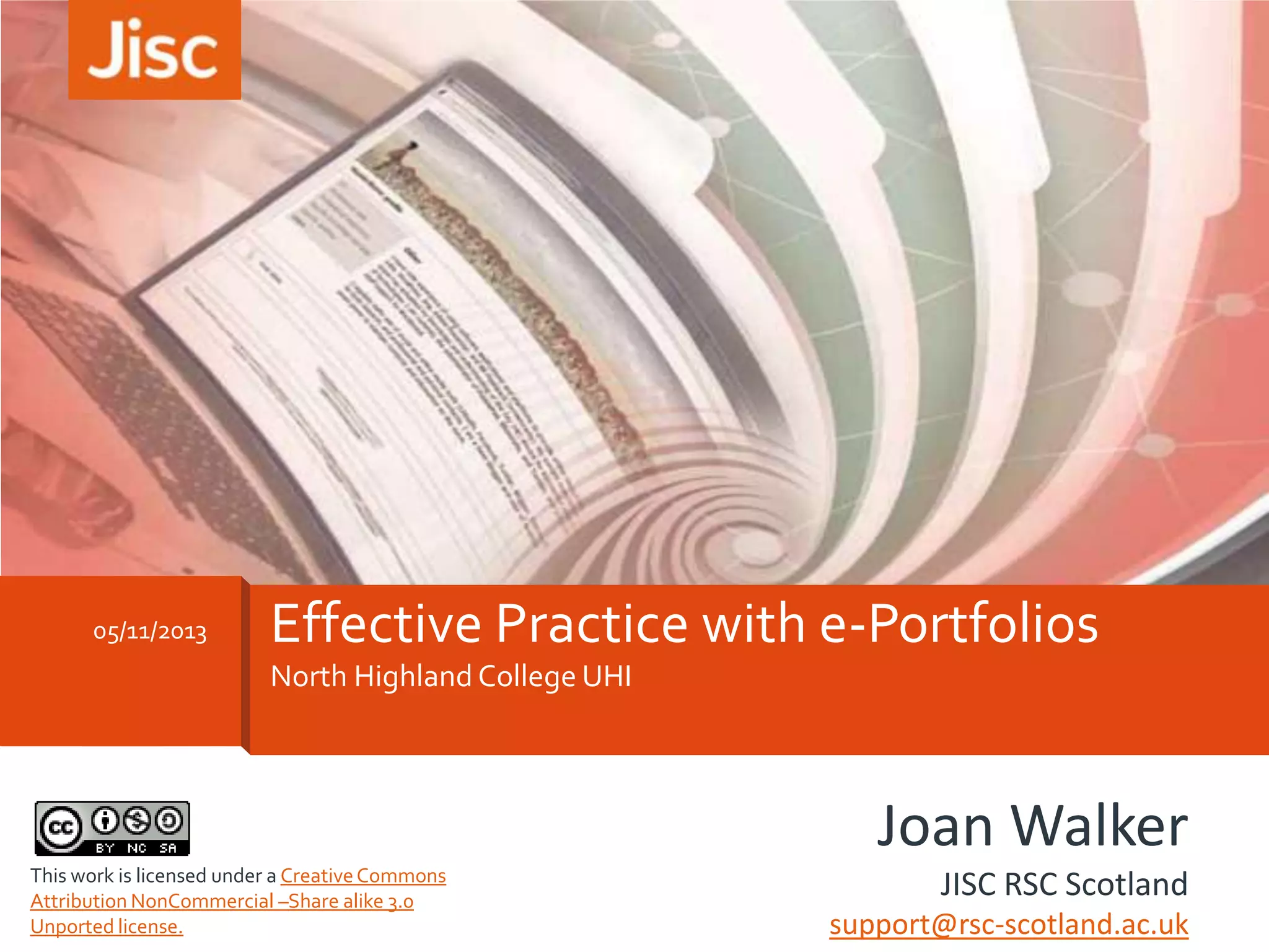 This document discusses effective practices for using e-portfolios. It defines e-portfolios as online spaces for storing digital work, presenting selections to others, and supporting processes like authoring and reflection. E-portfolios can serve as repositories, assessments, professional development tools, or showcases. They require balancing institutional control with learner control. Assessment can involve archiving evidence for evaluation or submitting work for marking. Effective e-portfolio use involves aligning their purpose to context and designing learning activities accordingly while technologically and pedagogically supporting processes, ownership, and transformation.
