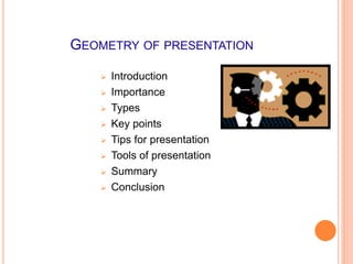 This document provides tips for an effective presentation. It discusses the geometry and structure of a presentation, including introducing the topic, importance, types, key points, tips, and tools. It covers types of presentations like informative, analytical, and persuasive. Tips include understanding the audience, preparing content, confident delivery, and controlling the environment. When preparing content, the document recommends including a title, outline, background, summary, and conclusions. Tools for presentation include slides, videos, pictures, graphs, and oration. The document provides examples of good and bad practices for slides, fonts, backgrounds, colors, spelling/grammar, videos, pictures, graphs, and oration.