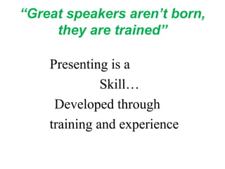 This document provides guidance on developing effective presentation skills. It discusses designing slides with easy to read text sizes and fonts, using color combinations that are visible when projected, and limiting distracting animations and backgrounds. The content should complement the speaker and have an appropriate density. Visual aids should outline main points, support the audience needs, and supplement not dominate the presentation. An effective speaker uses vocal techniques like varying pitch and pausing, makes eye contact, and practices delivering the presentation with notes or a script. The closing summary should restate the key points and allow for questions.