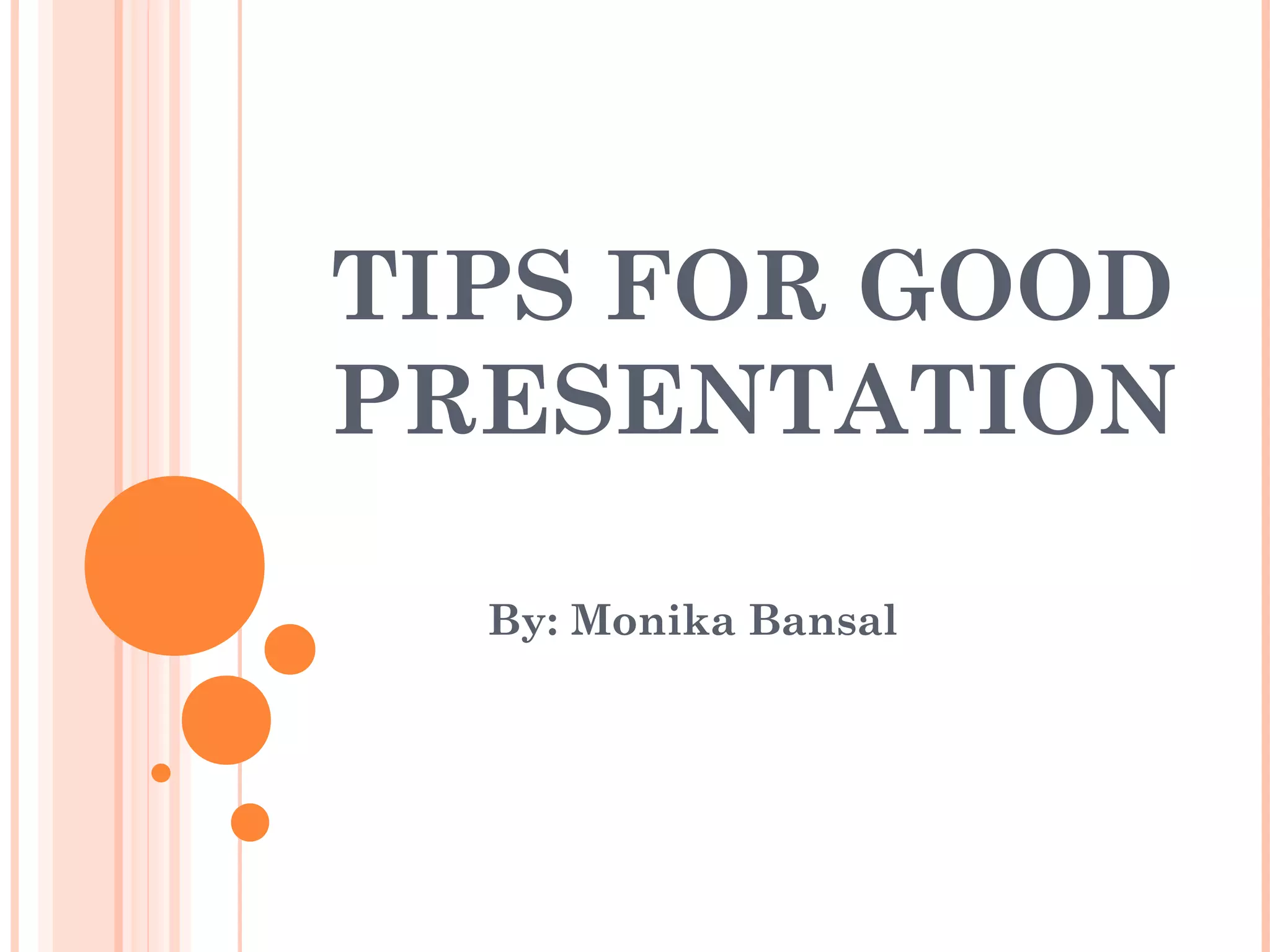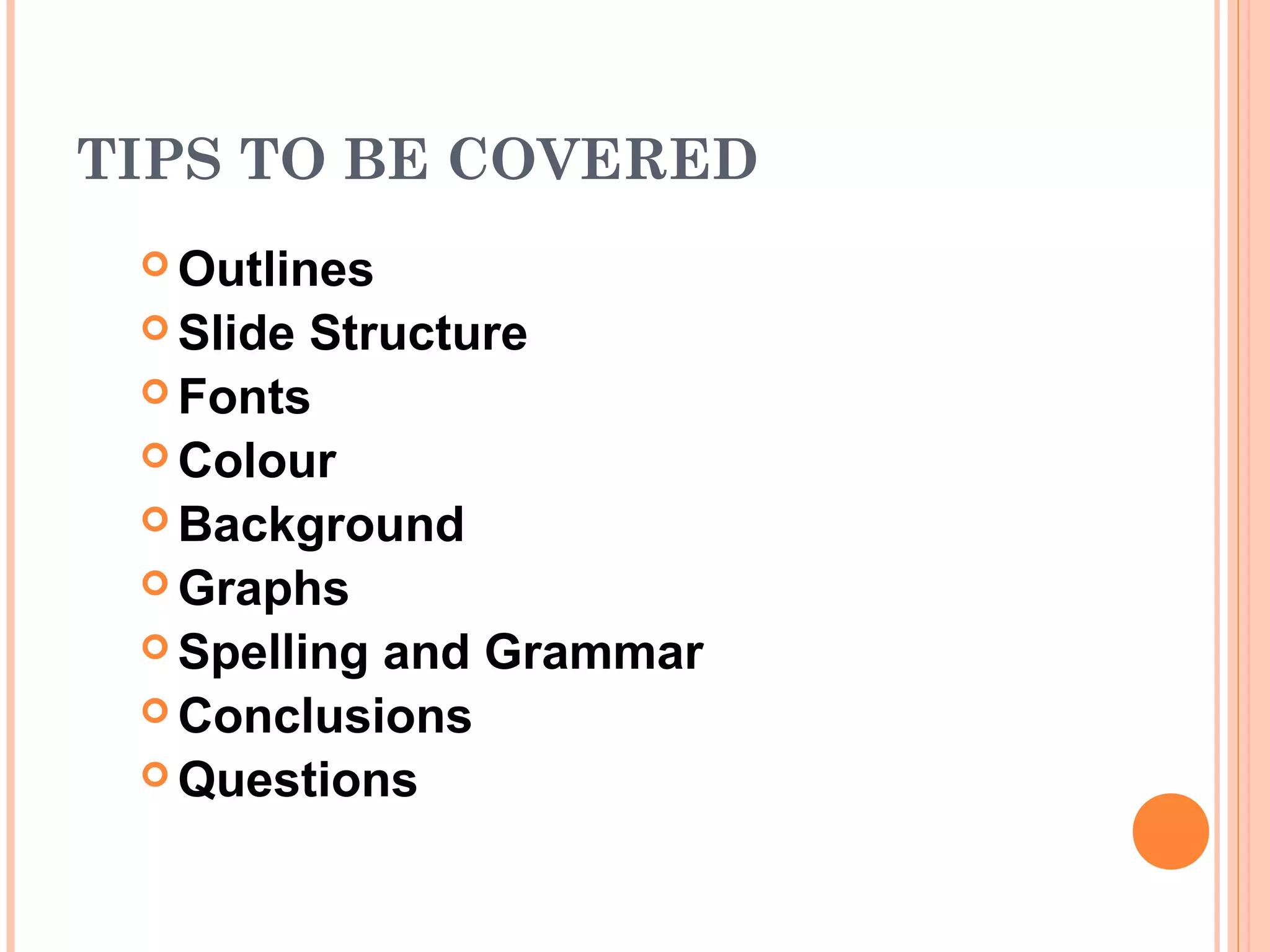 This document provides tips for creating good presentation slides. It recommends including an outline slide at the beginning to overview the presentation. Slides should have 1-2 points per minute, in point form with 4-5 points maximum per slide. Font should be at least 18 point and easy to read. Backgrounds and colors should contrast without being distracting. Graphs are preferable to tables for data, and should be labeled clearly. Spelling and grammar should be proofed, and the conclusion should summarize key points with potential for future research.