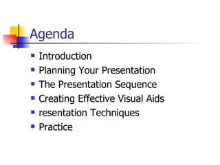 The document provides tips for giving effective presentations. It discusses planning presentations by determining the purpose and assessing the audience. When giving a presentation, speakers should build rapport with the audience, clearly introduce the topic, present the main points while engaging the audience, and conclude by summarizing the key points. Effective presentation techniques involve vocal delivery, body language, and avoiding common problems. Visual aids should supplement the presentation, outline the main points, and serve the audience's needs.
