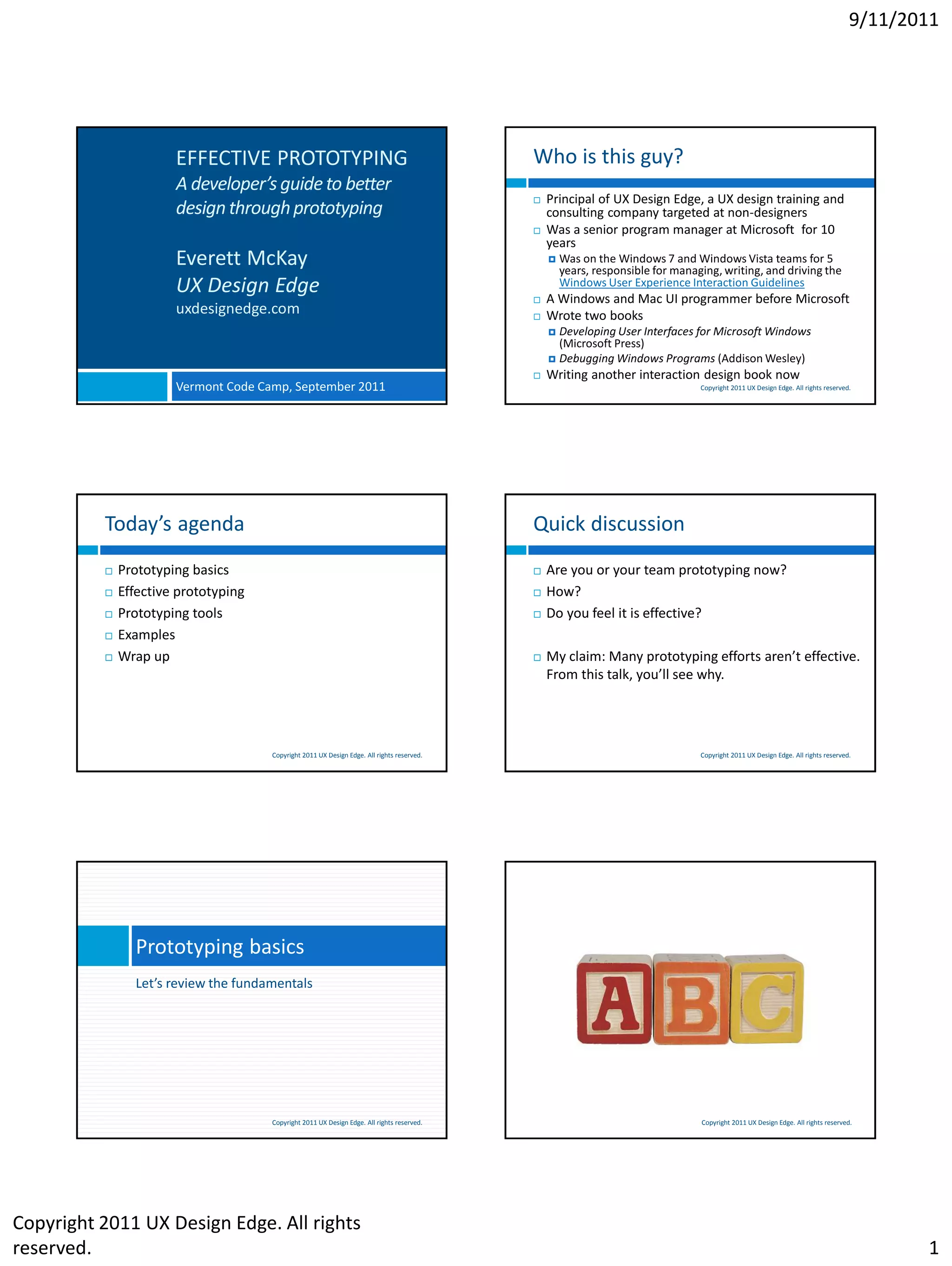The document discusses effective prototyping in UX design, emphasizing the importance of having clear goals and choosing appropriate tools and levels of fidelity for prototypes. It provides a detailed overview of the different types of prototypes, their purposes, and best practices for achieving design effectiveness. The author, Everett McKay, shares insights from his experience in the field, including common pitfalls and strategies to improve prototyping efforts.