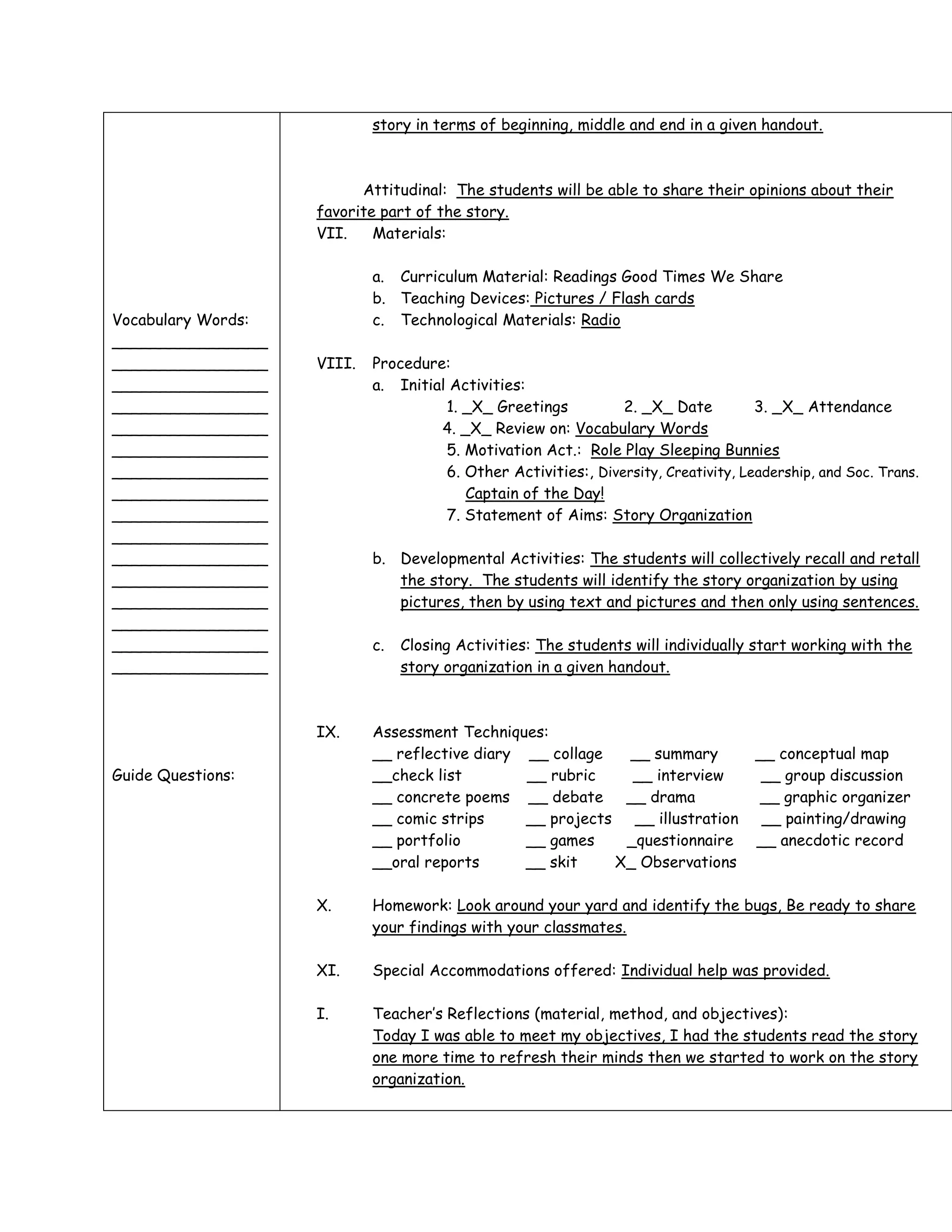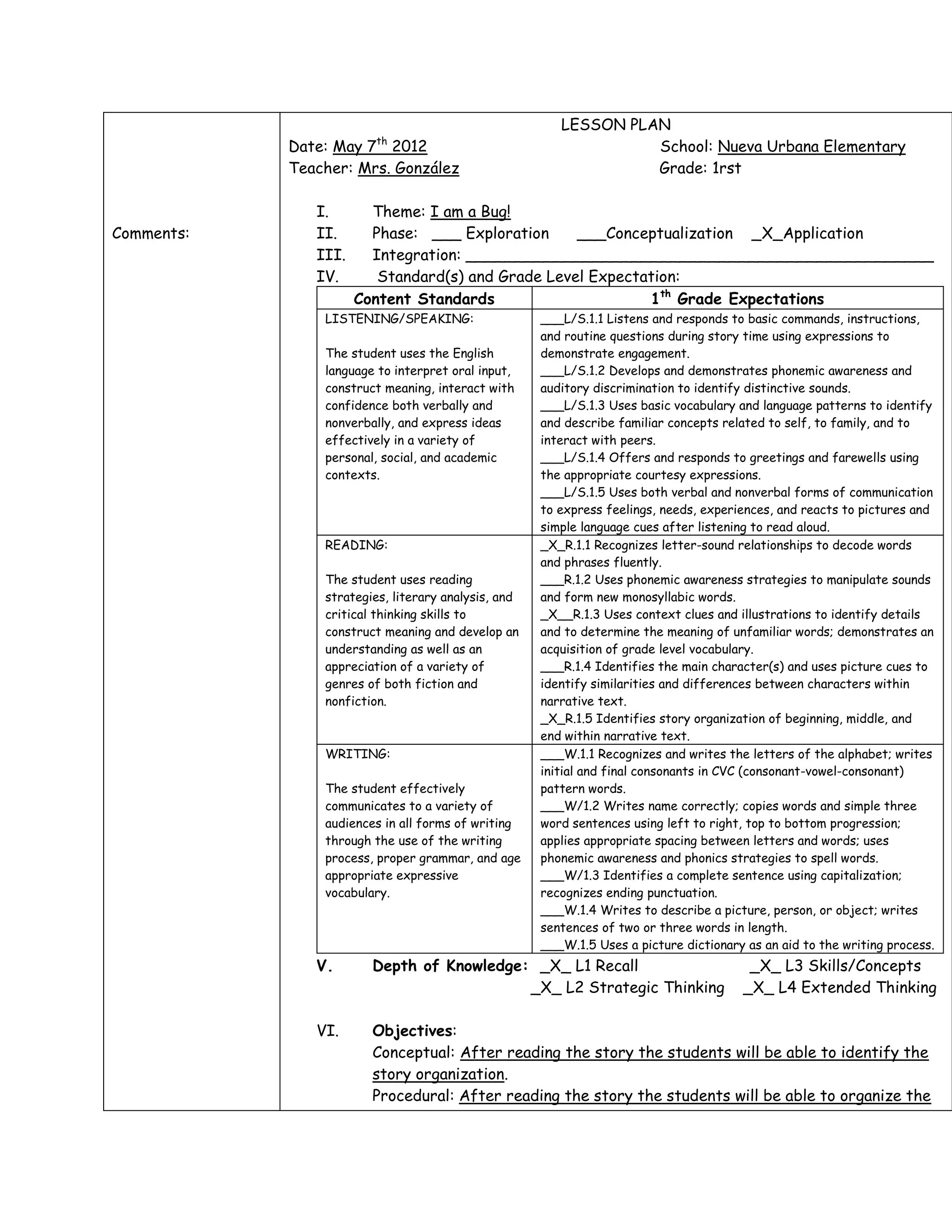 This 1st grade lesson plan focuses on reading comprehension of the story "I am a Bug!". Students will collectively recall and retell the story to identify the beginning, middle, and end. They will then practice organizing the story events using pictures, text and pictures, and sentences alone. To assess comprehension, students will individually complete a story organization handout. The teacher aims to develop the students' reading comprehension skills through engaging initial activities, developmental exercises moving from concrete to abstract examples, and individual application.