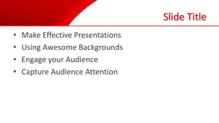 This presentation provides tips for making effective presentations using awesome backgrounds to engage audiences and capture their attention. It discusses using backgrounds and features of Product A and Product B to enhance presentations.