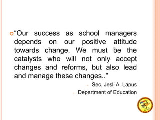 This document discusses school leadership in the context of a School-Based Management (SBM) environment. It outlines 10 principles of effective school leadership, including setting accountable goals, ensuring jobs are understood and accomplished, and developing teamwork. The roles and functions of school heads as educational leaders are also described, such as setting the vision and curriculum, and creating an environment conducive to teaching and learning. Different levels of school leadership maturity are identified from standard to progressive to mature. The challenges of collective responsibility and utilizing skills in communication, collaboration, and community building are also highlighted.