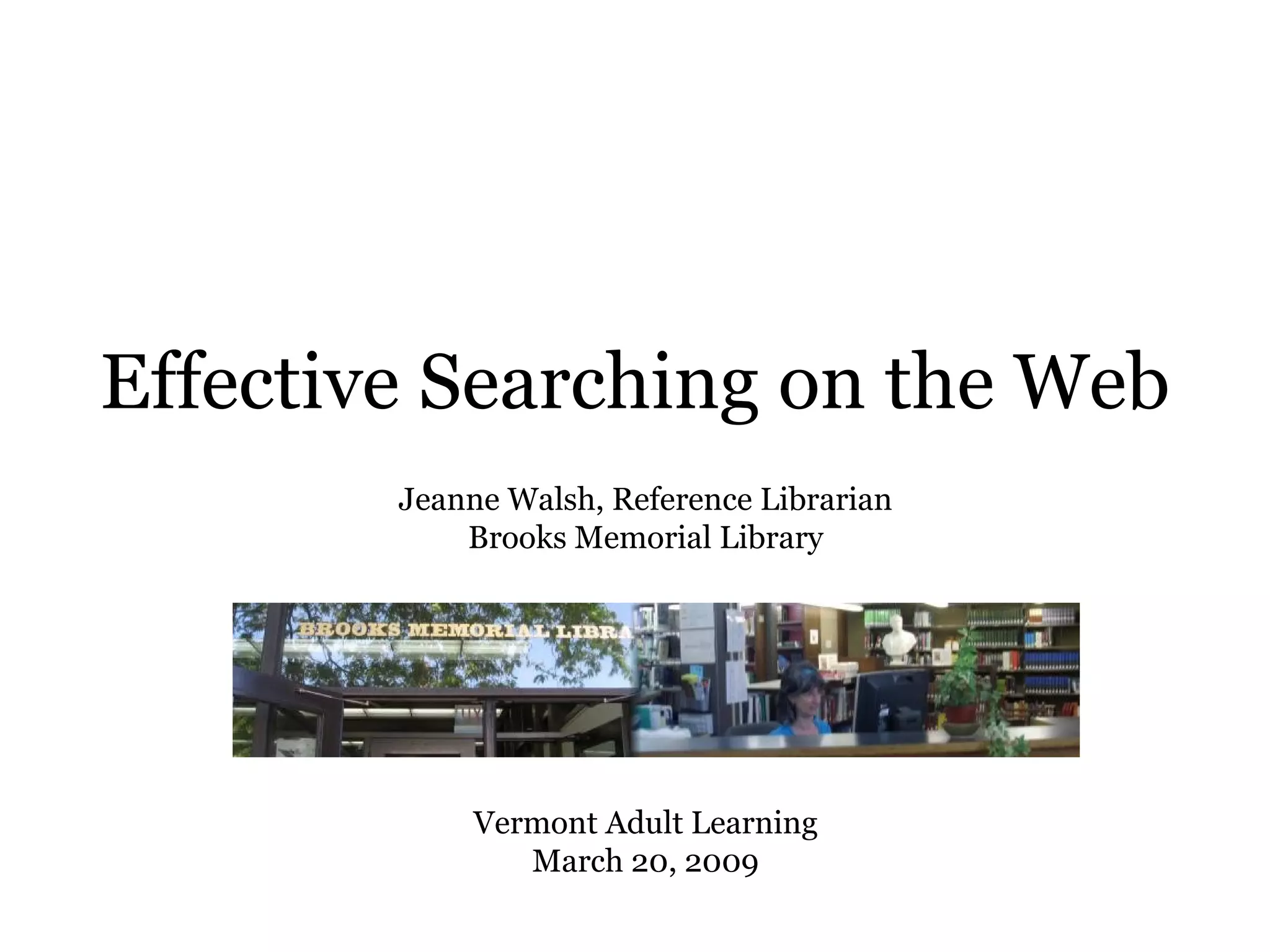This document provides tips for effective searching on the web. It discusses evaluating search queries, using advanced search features and Boolean logic, exploring different search engines and directories, evaluating search results, and tips for using websites. The key points are to think about search terms and topics, use advanced features to refine searches, check multiple search tools as they provide different results, carefully evaluate results for reliability and bias, and leverage site features for navigation.