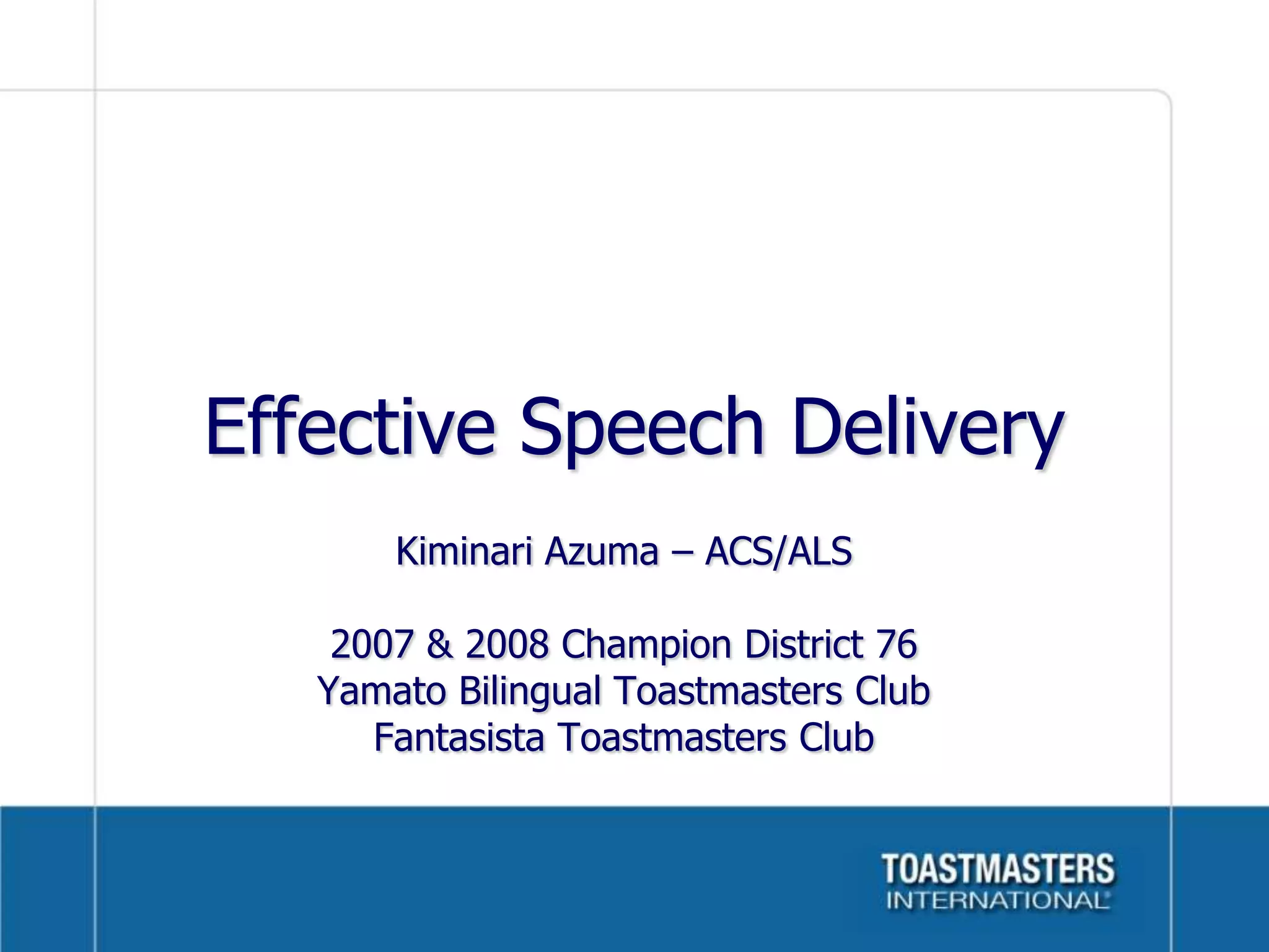 This document provides guidance on effective speech delivery. It discusses using voice, body language, and brain engagement strategically based on the objective of the speech. The goals are to inform, inspire, entertain or put the audience to sleep. Specific techniques are recommended for voice pitch, rate, strength, and pauses. Using the head, face, hands, and body can add emphasis and show structure or passage of time. Practicing in front of others and getting feedback helps improve delivery skills.