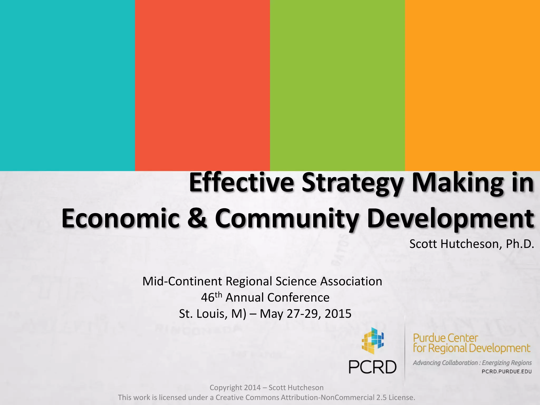 This document summarizes a presentation on effective economic and community development strategies. It finds that effective strategies tend to have network structures, be asset-based, involve iterative planning and implementation, include short-term goals, decentralize implementation, and use metrics to learn what works. A study interviewed experts and surveyed participants in strategies, finding moderate to strong correlations between effectiveness and factors like network structures and asset-based approaches. The document concludes that using an approach called "strategic doing" may help enable effective community collaborations.