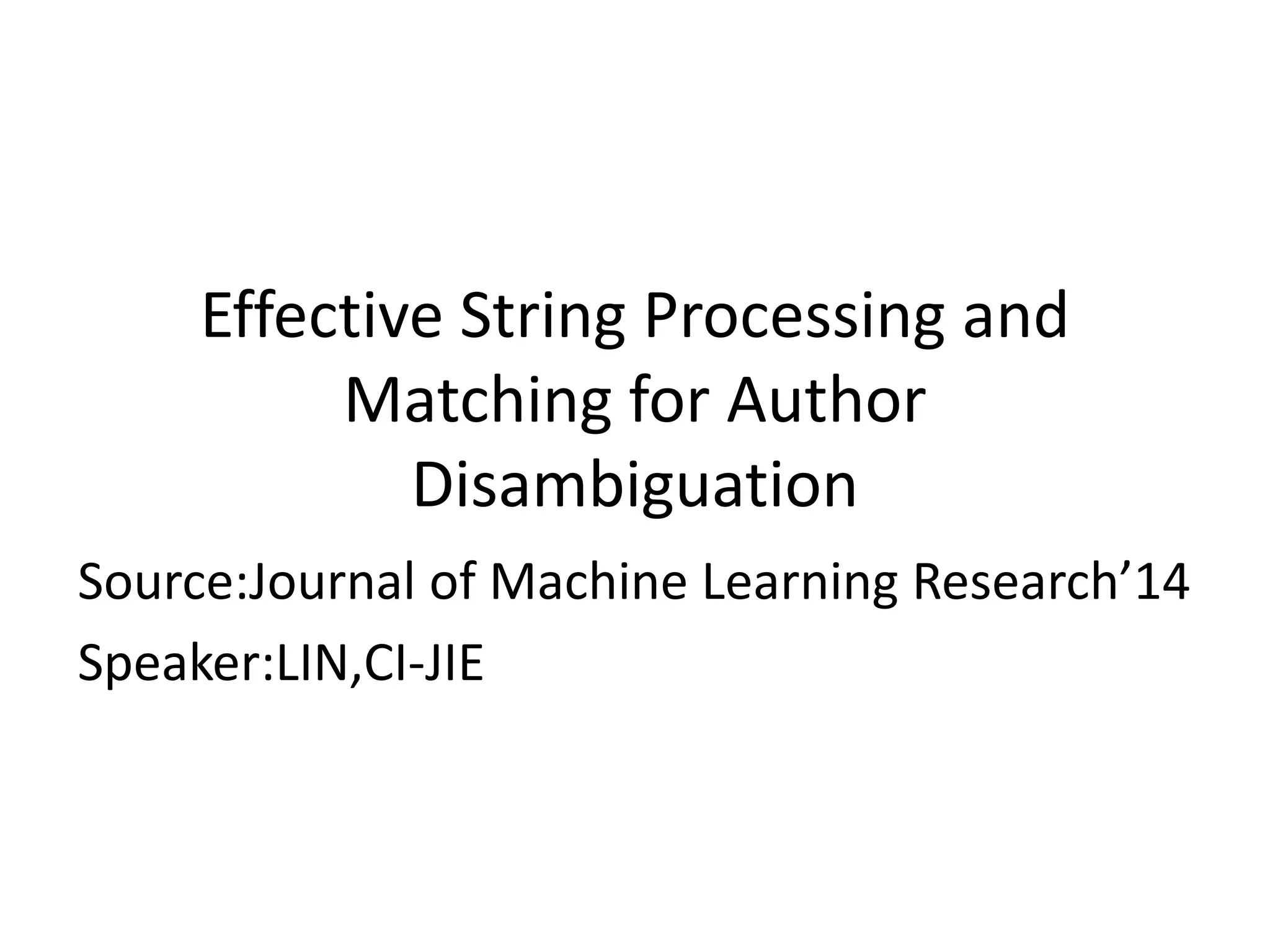 This document describes a method for author disambiguation that uses effective string processing and matching. It presents strategies like identifying duplicates based on string matching and classifying authors as Chinese or non-Chinese. It also describes a framework involving cleaning names, selecting authors, identifying duplicates, splitting groups, and linking identifiers. Two implementations of the framework are discussed in detail, and an ensemble approach is presented to improve performance.