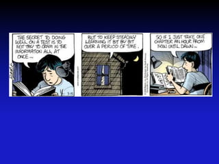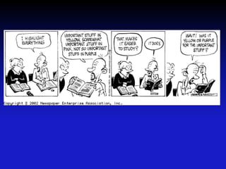 This document provides study tips and examination preparation strategies. It discusses effective note-taking techniques, such as listening for key points during lectures and rewriting notes after class. Successful study habits include planning study sessions, eliminating distractions, and reviewing material daily. Specific study methods like using flashcards, imagery techniques, and study groups are also outlined. The document concludes by emphasizing the importance of English language skills and describing different types of examinations, such as multiple choice questions, short answer questions, and oral exams.