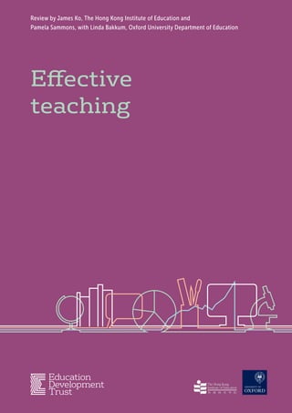 This document discusses challenges in defining effective teaching. It notes that effective teaching requires criteria related to educational objectives, which can vary over time and place. Common objectives include promoting cognitive development and literacy. Definitions of effective teaching often focus on student outcomes or teacher behaviors that promote outcomes. The review examines perspectives and evidence from inspections, teachers, principals, and students. It also explores characterizing effective practices and measuring teacher impacts considering school and departmental contexts.