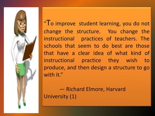 Effective teaching practices have a greater impact on student learning than changes to school structure. The most successful schools have clear instructional goals that guide both pedagogy and structure. Highly effective teachers design engaging lessons, provide appropriate instruction and feedback to students, and establish supportive classroom environments where students feel comfortable participating.