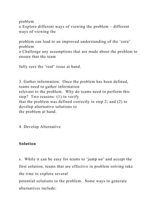 The document outlines an effective team decision-making process, emphasizing the importance of complementary skills among team members to enhance problem-solving. It details a structured approach, including recognizing and defining the problem, gathering information, developing alternatives, selecting the best solution, implementing it, and evaluating the outcome. Additionally, it discusses the concept of shared leadership, suggesting all team members should participate actively in decision-making roles.
