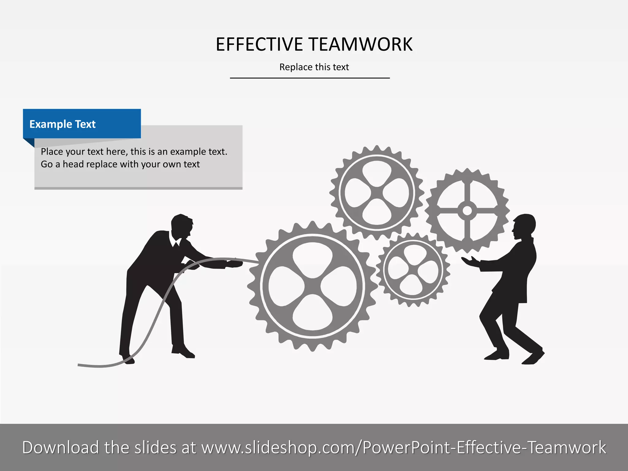 The document appears to be a presentation on effective teamwork. It contains mostly placeholder text asking the presenter to replace it with their own content. The presentation includes slides on communication, motivation, contribution, results, key aspects of effective teams like clear mission and roles, and characteristics of successful teams such as continuous improvement and open communication. It encourages the development of harmonious, aligned, empowered teams with a shared understanding of goals and strategies.