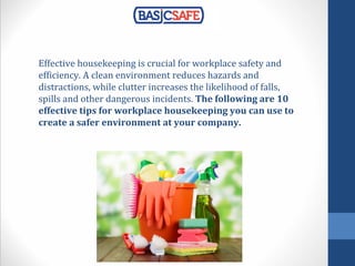 The document provides 10 effective tips for workplace housekeeping to enhance safety and efficiency, highlighting the importance of cleanliness in reducing hazards. Key recommendations include preventing slips and falls, controlling fire hazards, training employees, recognizing safe behavior, and maintaining organized storage. It emphasizes the role of good housekeeping as an indicator of management quality and employee engagement.