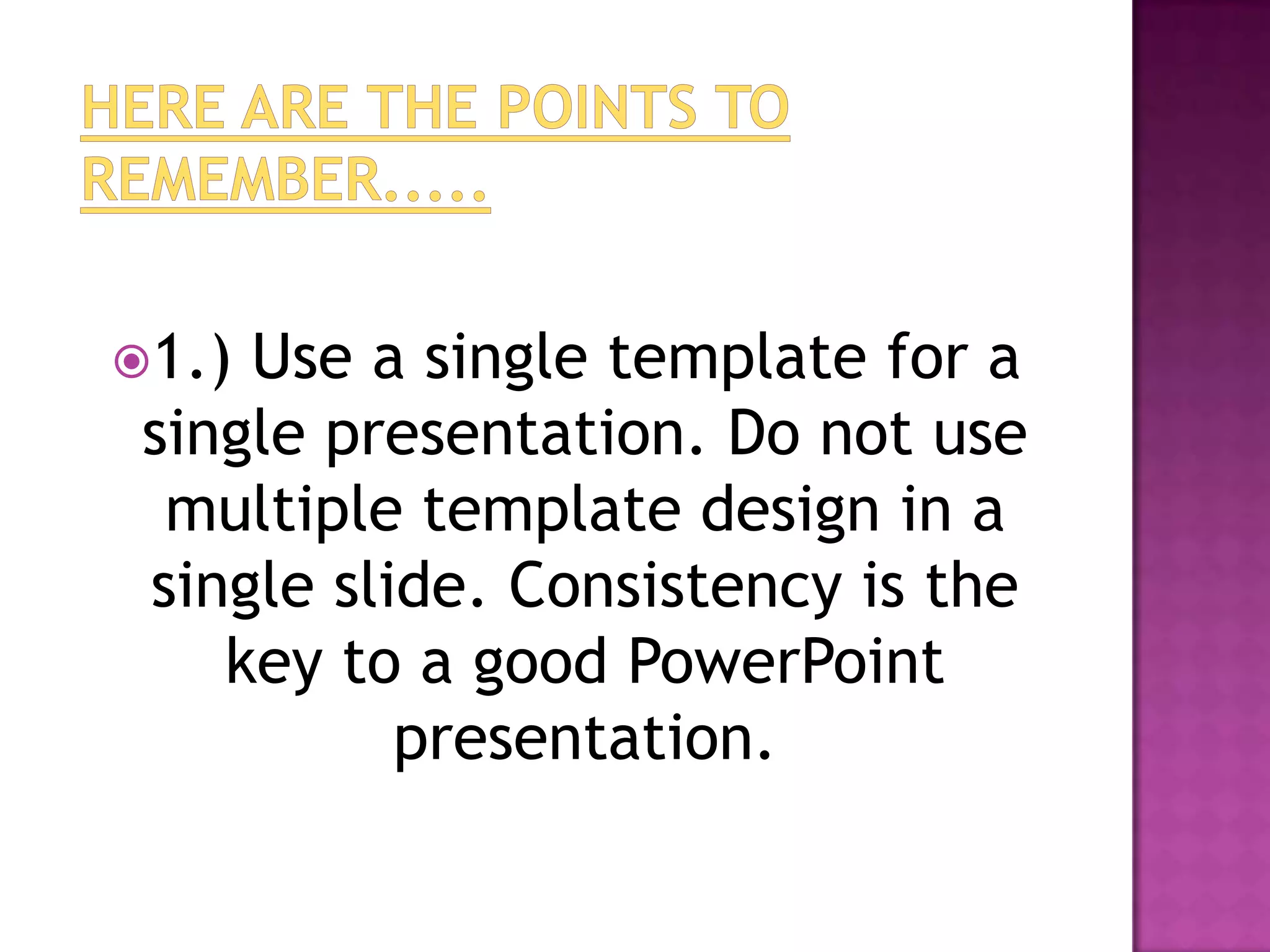 The document provides 20 tips for creating effective PowerPoint presentations with consistency, simplicity, and clarity. Key recommendations include using a single template, standard colors, descriptive titles, tables of contents, short bullet points, varied media like images and videos to engage audiences, and leaving room for discussion on the last slide. The overall goals are to maintain professionalism, structure information flow, and keep audiences focused on the main ideas.