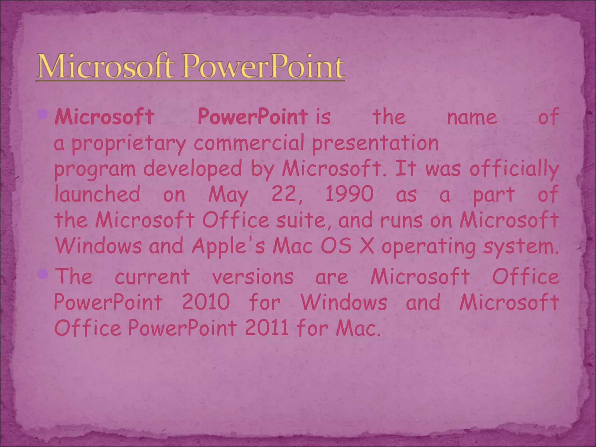 Microsoft PowerPoint is a presentation program developed by Microsoft that was officially launched in 1990. It allows users to create slide presentations consisting of text, graphics, videos and other objects that can be displayed on a computer screen or projected for live audiences. PowerPoint provides animation features to control elements on individual slides and transitions between slides. While PowerPoint can be an effective tool for illustrating a presentation when used sparingly, overuse of animations, too many slides with too much text, and relying on the software rather than public speaking skills can detract from the presentation.