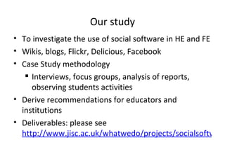 The document summarizes a study on the effective use of social software in higher and further education. The study used case study methodology including interviews, focus groups, and analysis of reports to investigate the use of social media like wikis, blogs, Flickr, and Facebook. The study aimed to derive recommendations for educators and institutions on using social software and delivered results and recommendations available online. It discusses benefits and challenges of social software for institutions, educators, and students and the role of educators in effectively integrating social media.