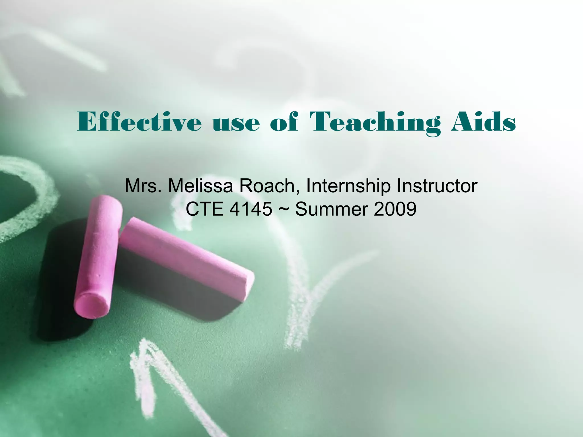 The document discusses effective use of teaching aids. It provides tips on choosing the appropriate visual aid based on context, and how to effectively use common teaching aids like whiteboards, overhead projectors, PowerPoint, and various media. The advantages and disadvantages of different teaching aids are outlined to help instructors select options that best support their learning objectives and engage students. Key considerations for using teaching aids effectively include preparation, presentation skills, readability, and relevance to the topic.