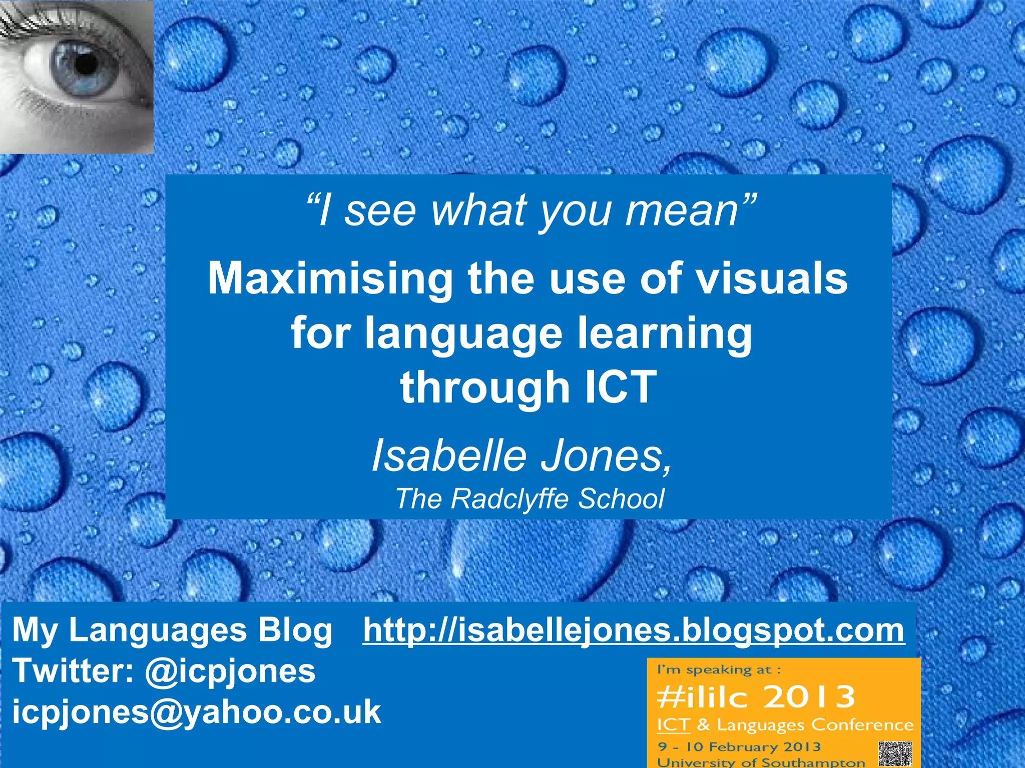 This document discusses maximizing the use of visuals for language learning through information and communication technology (ICT). It explores creating effective visuals using colors, pictures, and photographs to support language learning and memorization. It also examines ICT tools for making visuals, such as Flickr, and organizing and sharing visual resources. The goal is to widen the repertoire of visuals that can enhance language instruction.