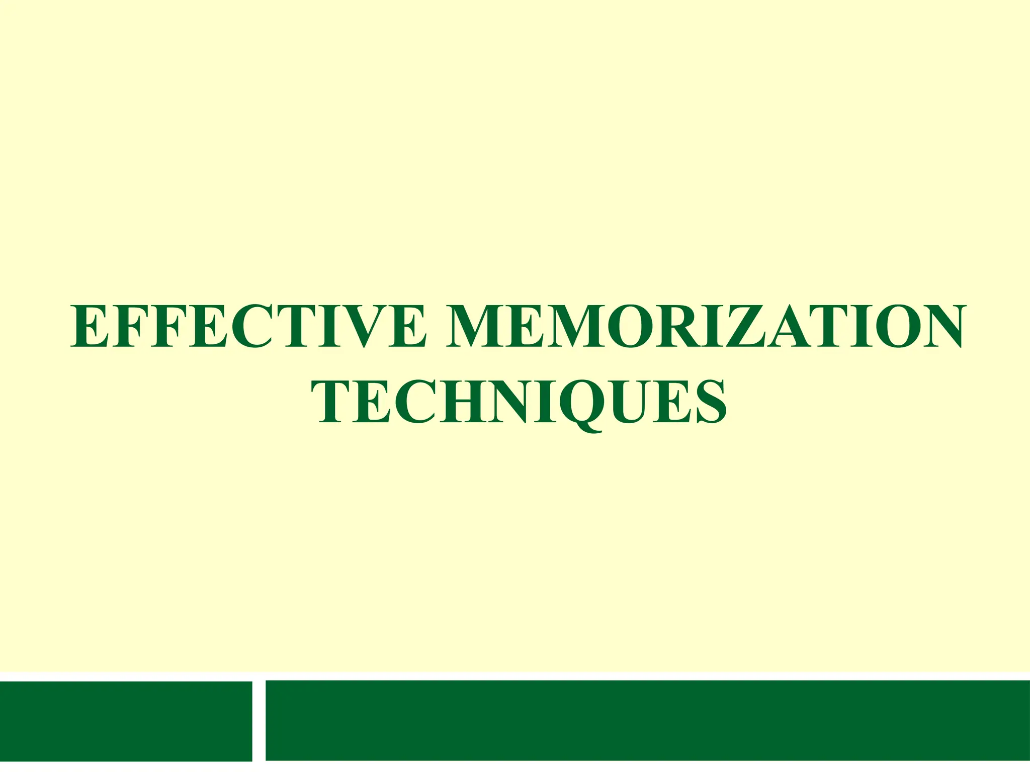 The document discusses effective memorization techniques emphasizing the importance of using various brain functions and creating associations for better retention. It outlines methods such as mnemonics, repetition, acronyms, and the use of rhythm and song to enhance memory. Additionally, it provides tips on study habits, including dedicated study times, regular reviews, and maintaining a positive mental attitude.