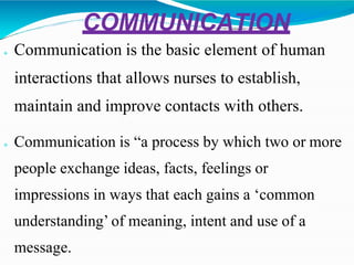 Communication is the basic element of human interactions that allows nurses to establish and maintain contacts with others. Effective communication can lessen medical errors and improve patient outcomes through increased recovery rates, safety, satisfaction, and adherence to treatment. Communication serves several purposes for nurses, including exchanging information, initiating care, interpreting procedures, and solving problems. Key elements of the communication process include the sender, message, channel, and receiver. Nurses must develop skills like confidence, critical thinking, empathy, and being a knowledgeable and active listener to communicate effectively with other nurses, supervisors, subordinates, and patients while maintaining ethical standards.