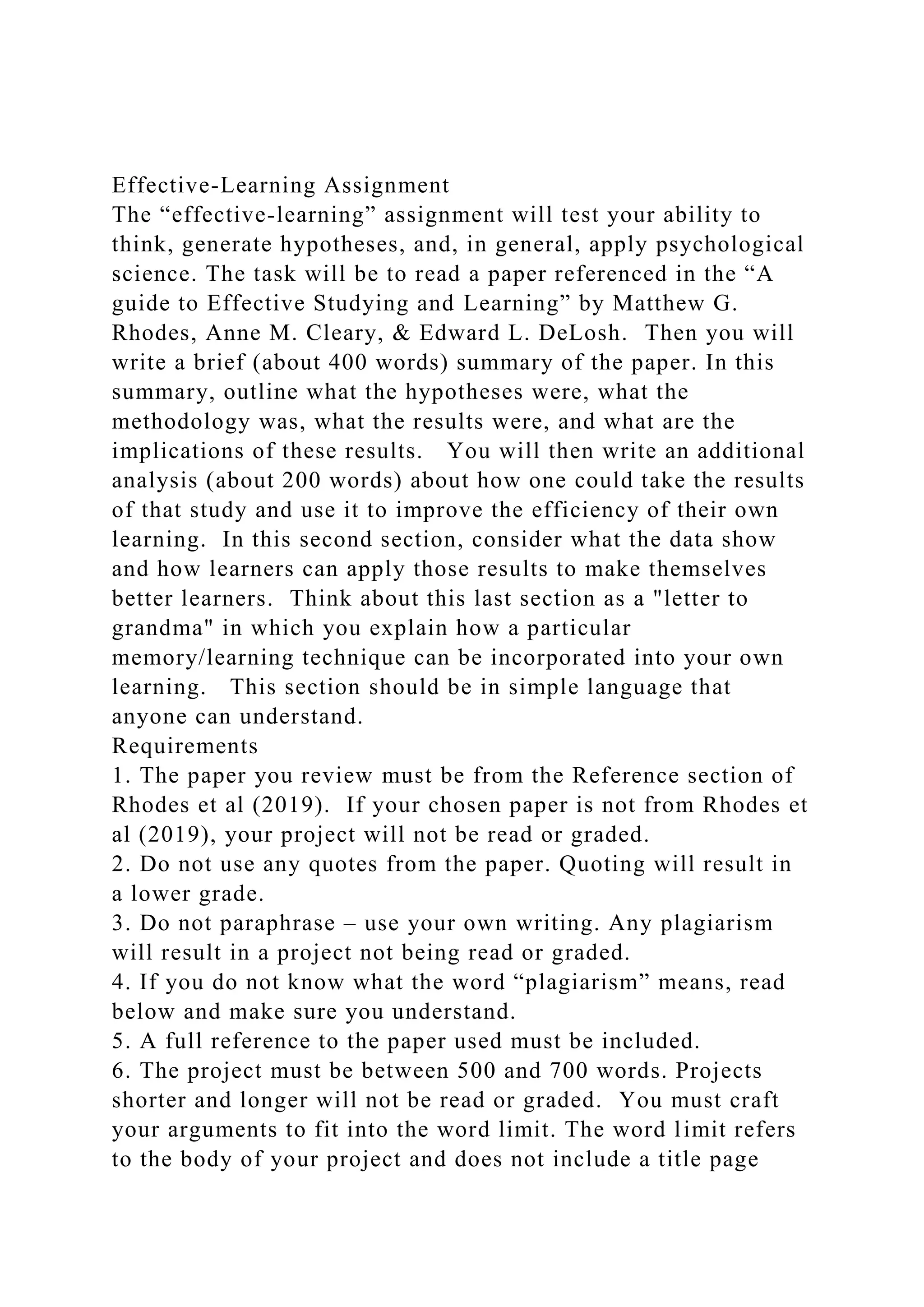 The 'effective-learning' assignment requires students to read a selected paper from Rhodes et al. (2019) and write a summary discussing its hypotheses, methodology, results, and implications, along with an analysis on improving personal learning efficiency based on the study's findings. Students must adhere to specific length and formatting requirements, avoid plagiarism, and incorporate their understanding of effective metacognitive strategies. The document emphasizes the relationship between metacognitive monitoring and effective study strategies, highlighting the importance of choosing appropriate study materials and time management in learning.