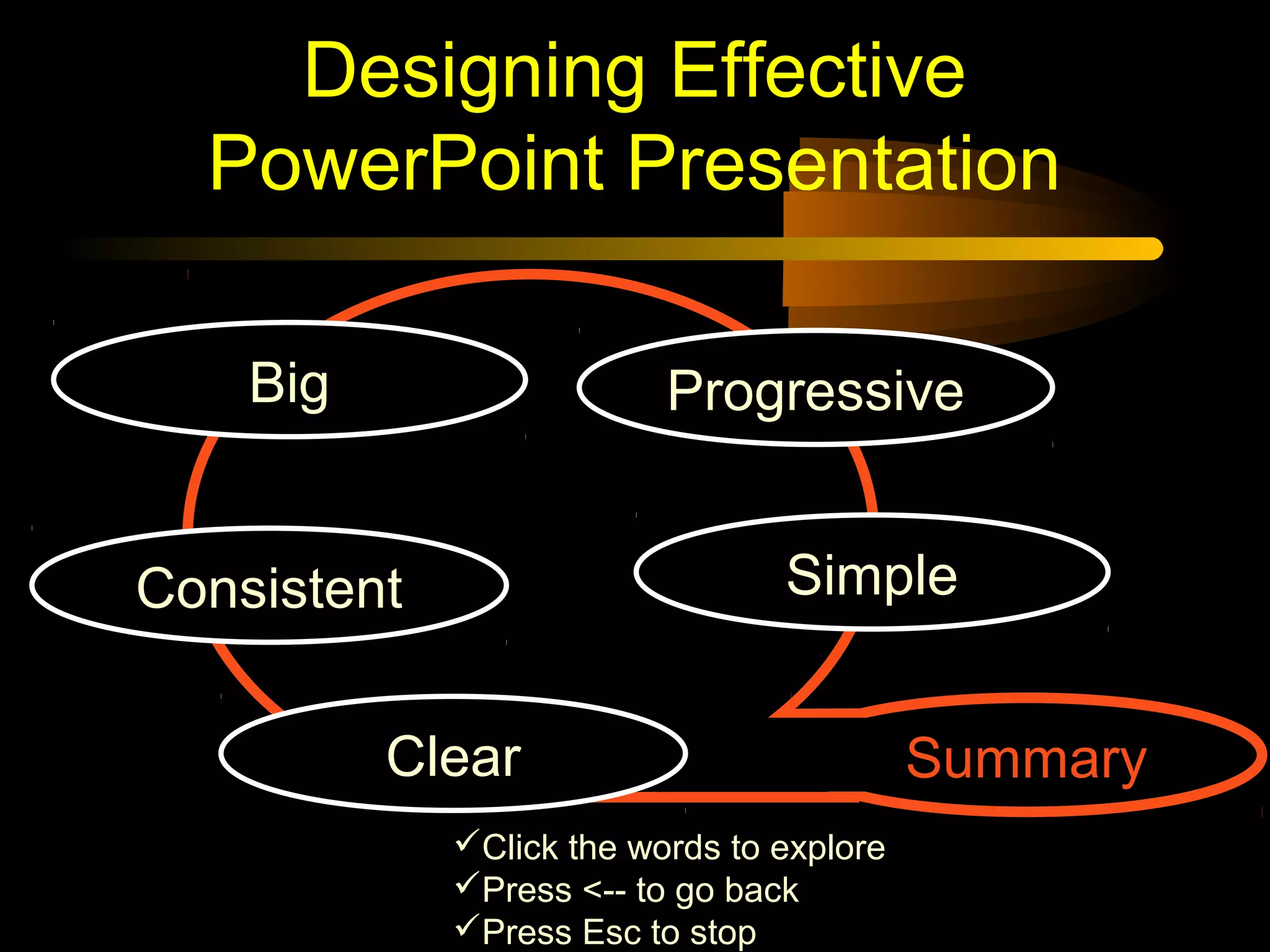 This document provides guidelines for designing effective PowerPoint presentations. It discusses making text and visuals big and simple to view from a distance, keeping content clear by using sans-serif fonts, high contrast colors, and focal points, progressing information in a step-by-step manner, and maintaining consistency in designs and formatting. The overall goals are to communicate content simply and clearly without distracting visuals or text, and to use visual aids and animations purposefully to enhance understanding rather than distract the audience.
