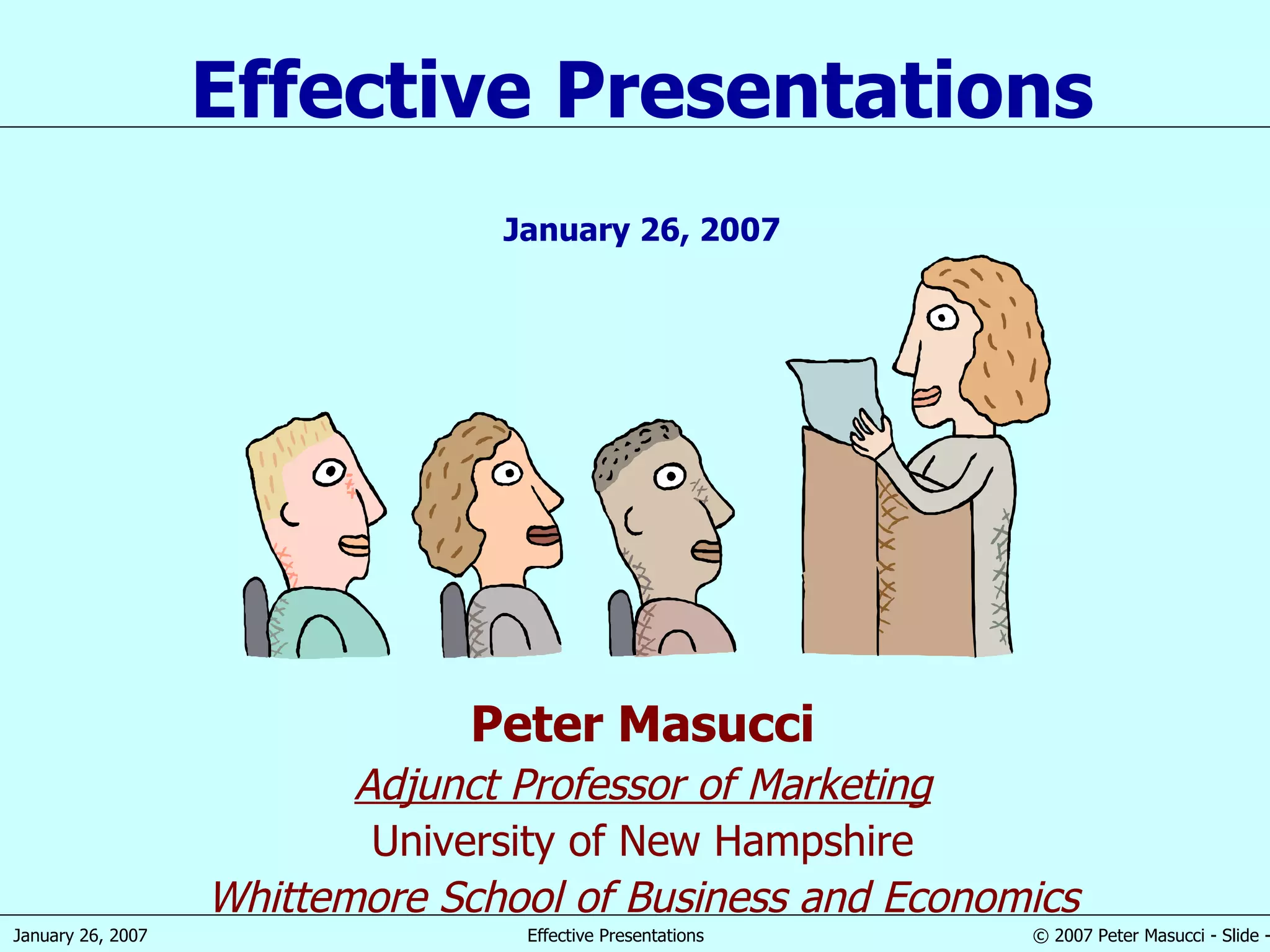 The document outlines an agenda for a presentation on effective presentations given by Peter Masucci, an adjunct professor. The presentation will cover planning presentations, presentation sequences, creating visual aids, and effective presentation techniques. It will discuss determining purpose and audience, organizing content, using storyboards, controlling anxiety, and designing slides. The goal is to inform attendees how to give polished, audience-centered presentations.