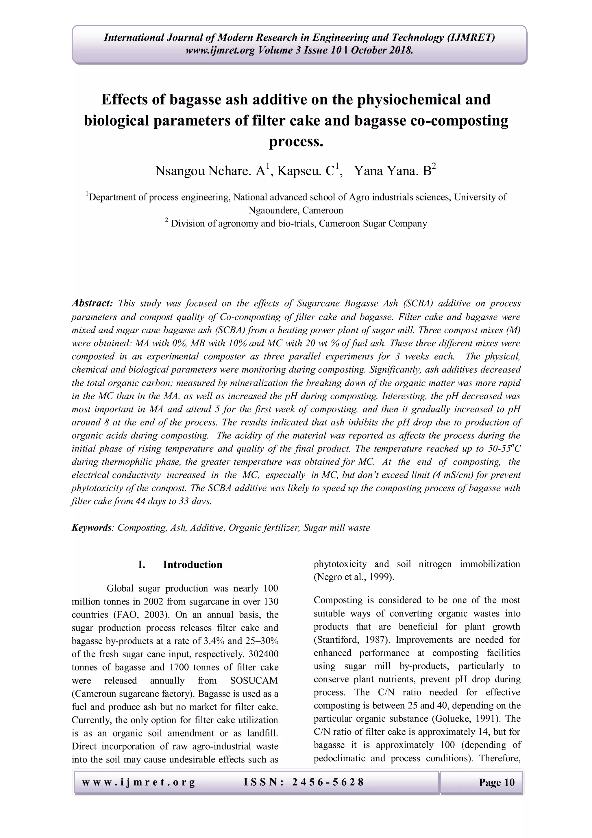 This study investigates the effects of sugarcane bagasse ash (SCBA) on the composting process of filter cake and bagasse, focusing on physical, chemical, and biological parameters. Results indicate that adding SCBA improved pH stability and accelerated the composting process, reducing the composting time from 44 to 33 days. Additionally, the presence of SCBA increased nutrient content in the final compost product while maintaining conductivity levels below phytotoxic thresholds.